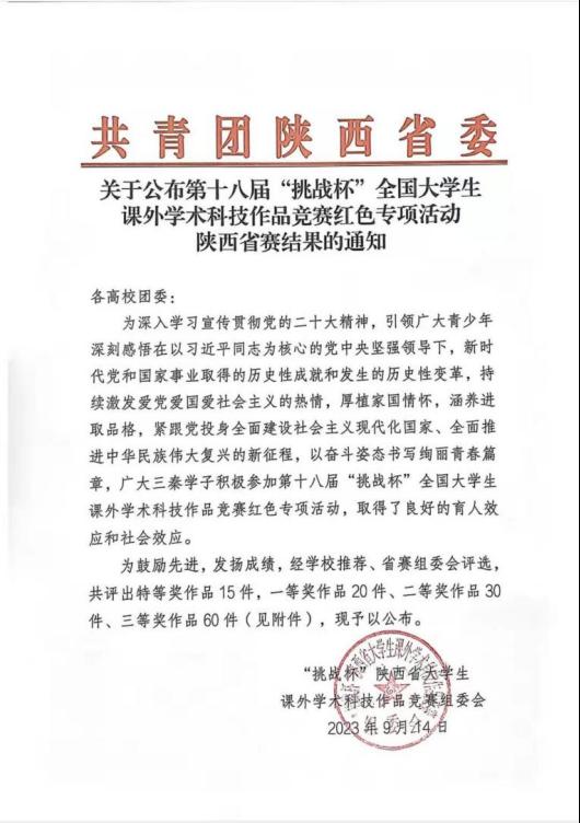 近日,第十八届“挑战杯”全国大学生课外学术科技作品竞赛红色专项活动省赛结果公布,经各高校推荐、省赛组委会评审,共评出特等奖作品15件、一等奖作品20件、二等奖作品30件、三等奖作品60件。其中,我校获得二等奖1项、三等奖1项。