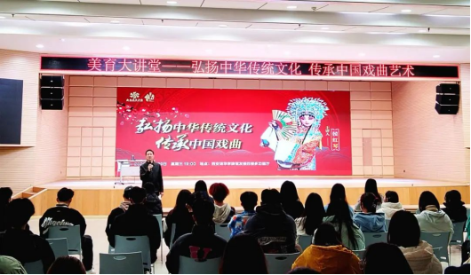 讲座开始,侯红琴老师用细腻婉转动听的戏曲唱腔为大家演唱了一首秦腔选段,并且用接地气的关中话为学生们深入浅出、形象生动的介绍了秦腔的起源、秦腔音乐、秦腔人物角色、秦腔脸谱、秦腔剧本等戏曲知识,及《轩门斩子》《铡美案》《下河东》《苏武牧羊》《金沙滩》《杨门女将》《陕北往事》等经典秦腔作品。