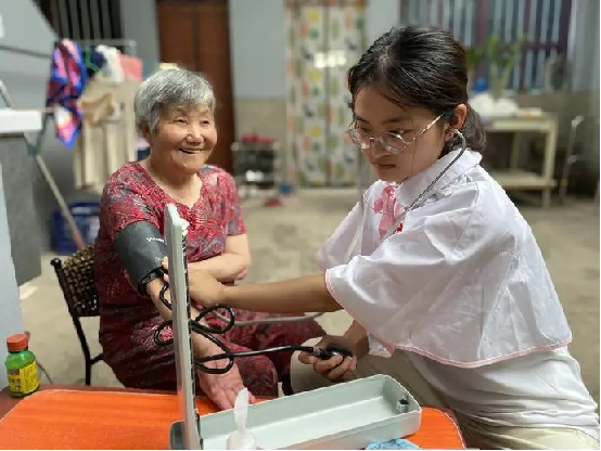 2021年,团队成员在临潼安沟村上门为村民测量血压