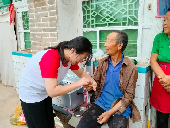 2021年夏天,南丁格尔护理志愿者服务队前往临潼区安沟村开展义诊活动,最开始大家都不愿接受义诊,村民们觉得“这群年轻的娃娃肯定也看不了啥病”,直到发生了一件事,村民们都在义诊摊位前排起了队。原来,安沟村的一位史奶奶因为与人争吵,情绪激动后突然出现语言障碍,只能发出无意义的音节,恰巧遇到志愿者正在挨家挨户上门问诊,家属急忙呼救,三个志愿者冲到史奶奶家里,轮流为她推拿胆经的穴位,并轻声细语地安抚。“奶奶,放松,慢慢来...”一个小时过去了,汗水浸透了他们的衣背。史奶奶的嘴唇颤抖着,艰难地挤出一个“谢”字,她的病情得到了有效的缓解。这一刻,所有的疲惫都化作了感动。自此,志愿服务队的“名气”在村里一下子火起来了。