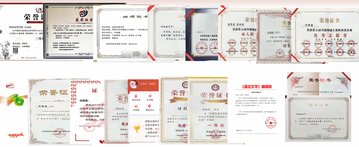 付羽洁获第七届全国大学生语言文字能力大赛全国二等奖、第五届丝路朗诵大赛陕西赛区一等奖、中国国际大学生创新大赛陕西赛区省级银奖、第七届全国大学生语言文字能力大赛省赛三等奖、陕西省第八届朗诵大赛三等奖、第16届全国大学生广告艺术大赛陕西赛区优秀奖等