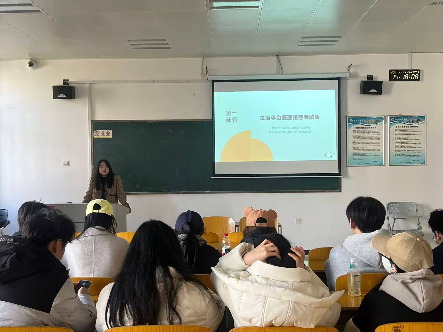 实战训练与指导过程中,金老师围绕自媒体商业化全链条展开系统分享。在主流平台变现路径解析环节,金老师聚焦抖音、快手、视频号、小红书、B站五大低门槛高适配平台,详细拆解各平台流量逻辑与变现模式,抖音的多元带货与广告合作、快手的“老铁经济”与分销佣金、视频号的私域转化与社交裂变、小红书的专业价值变现与品牌合作、B站的付费内容与会员分成,用具体数据对比不同平台的适配内容与收益潜力,帮助学生精准匹配个人定位。