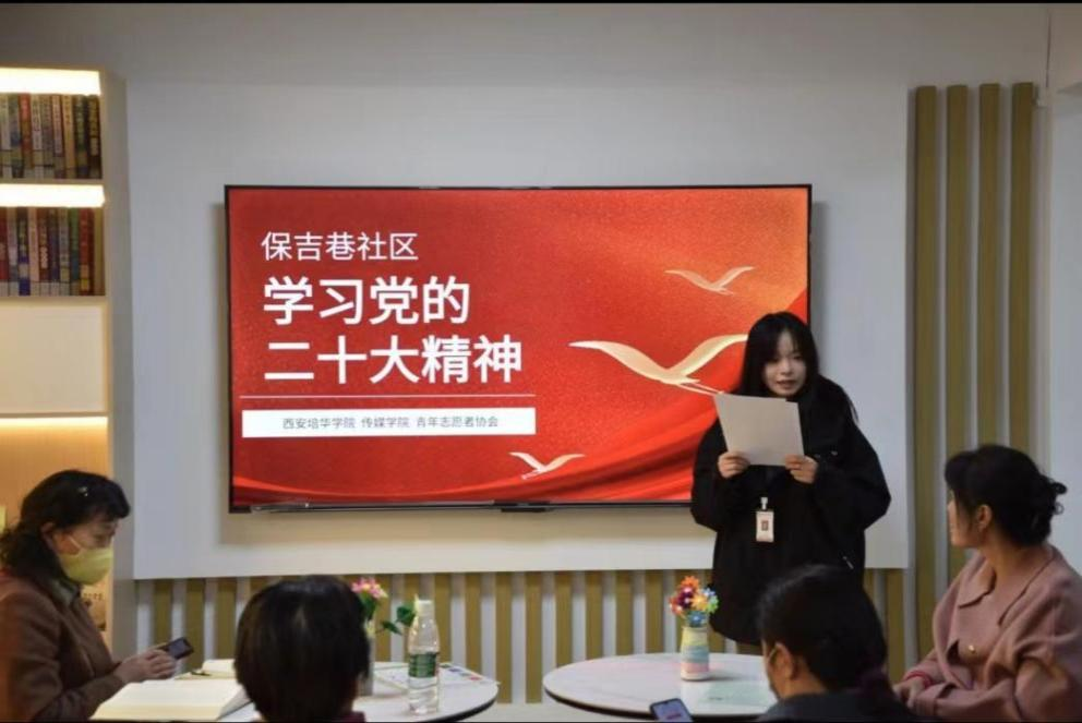 本次活动由西安培华学院传媒学院青年志愿者协会组织,由本组织雷锋服务部成员丁杨主持。共分为三个基本环节,一是中国共产党第二十次全国代表大会的会议精神普及,二是“挑战杯”知识竞赛,三是诗歌朗诵。共有28人参与。