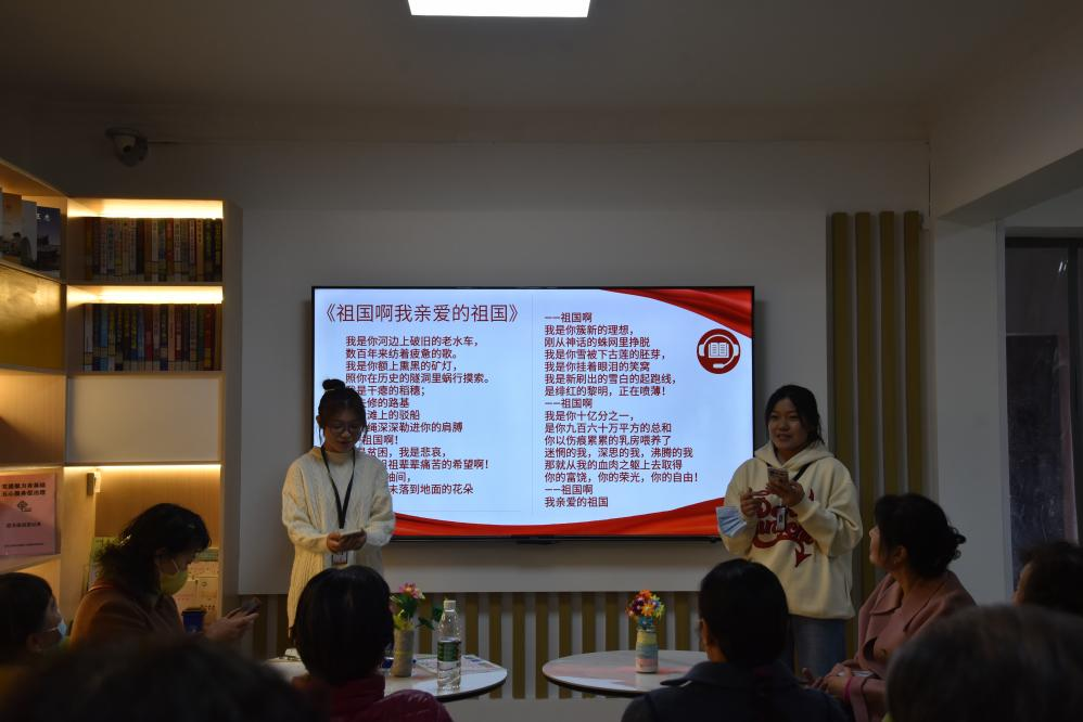 最后,进行朗诵环节,由志愿云成员刘佳欣、活动部成员田佳欣、活动部成员张子嫣和雷锋服务部王昕怡分别为大家朗诵《祖国啊我亲爱的祖国》和《盛世中国》这两首诗歌,老人们情绪高涨,掌声不断。