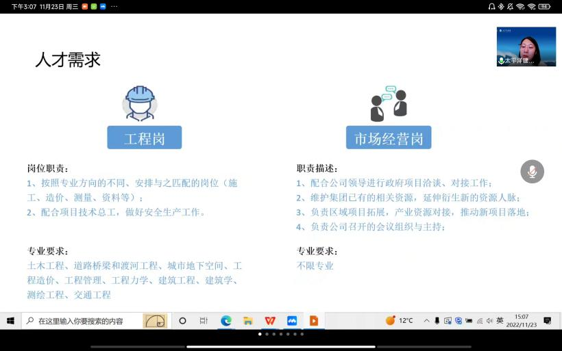 为拓宽传媒学院2023届毕业生就业途径,丰富毕业生的就业选择,满足各用人单位对优秀人才的需求,扩大就业范围,传媒学院联合了合作单位——聚光影业和太平洋建设集团有限公司,于11月23日下午召开线上专场招聘会。本次会议由乔安老师主持以及传媒学院2023届毕业生参加本次会议。