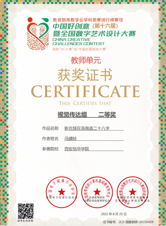 中国好创意暨全国数字艺术设计大赛由中国电子视像行业协会主办,旨在落实国家数字创意产业远景规划,转化高等院校原创知识产权,深度挖掘、选拔和推广中国创意界的精英人才和优秀作品的高级别赛事。这是我院第一次以学院为单位选拔报送优秀作品参与大赛角逐。在报送的71组优秀学生作品中,传媒学院广播电视编导专业赵宇琛老师指导2018级学生潘建丞的作品《寻火》荣获微电影组国家级一等奖,戏剧影视文学专业教师房宁老师指导2020级学生梁陆钧、许愿、谢文浩的作品《长安·常安》荣获视觉传达组国家级三等奖,广播电视编导专业范瑞婵老师指导2020级学生王琳的作品《老陕的味道》荣获微电影组省级三等奖。数字媒体艺术专业冯靖铃老师创作的作品《新仓颉在洛南造二十八字》荣获教师单元视觉传达组国家级二等奖。