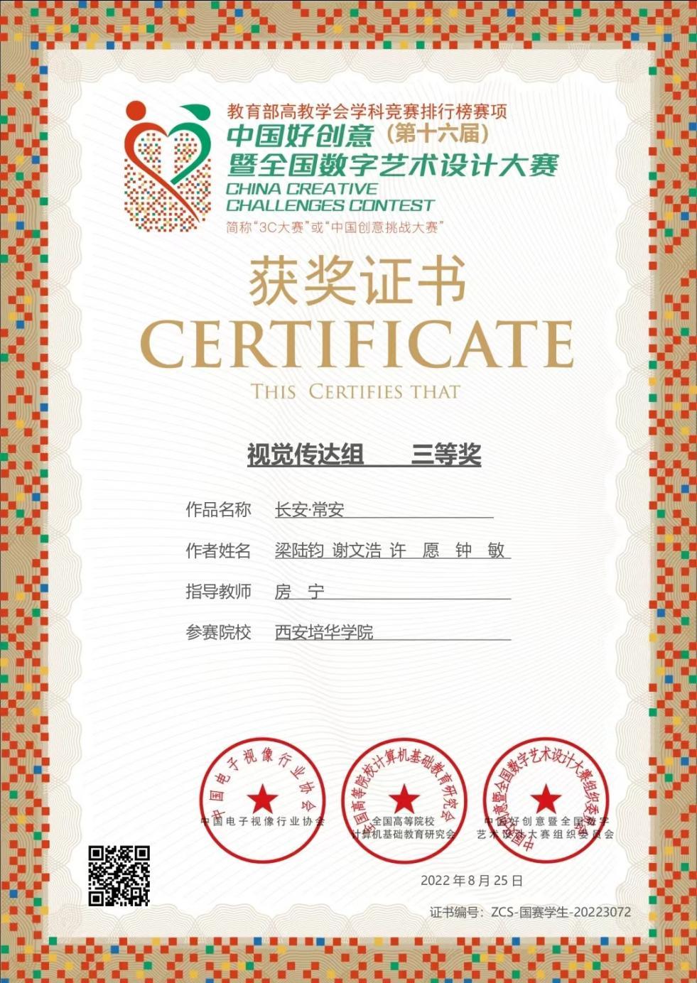 和视觉传达组国家级三等奖作品《长安·常安》获奖证书