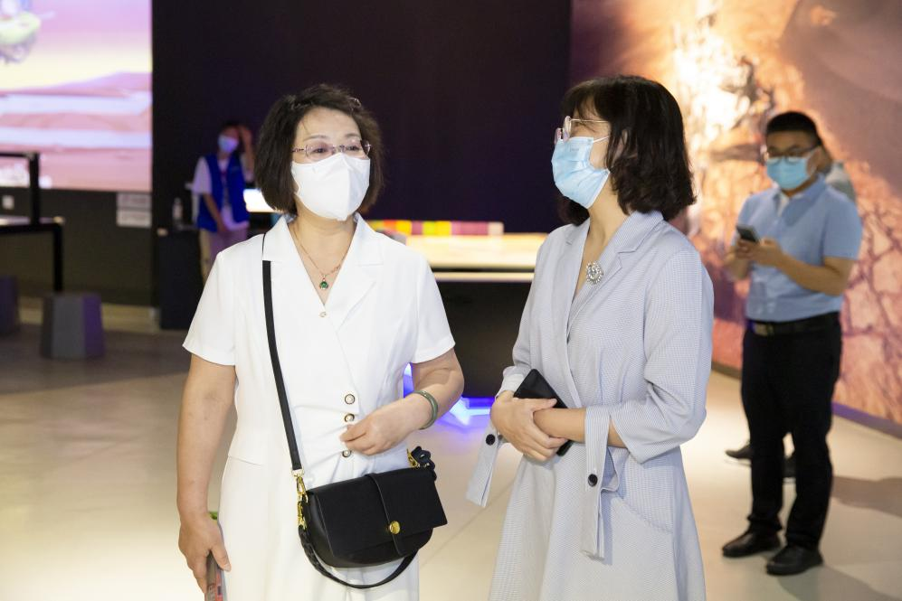 图为传媒学院常务副院长王西娅(左)与陕西中科大西科普文化发展有限公司总经理,九号宇宙馆长蒋焱交流