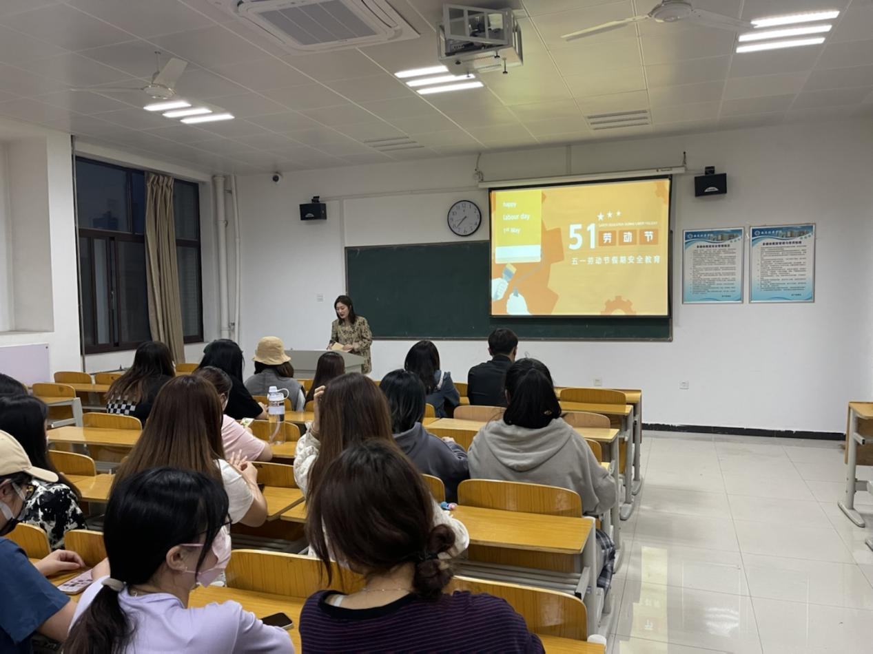 辅导员冯靖敏老师在班会讲到:在“五一”劳动节到来之际,为使同学们度过一个愉快、平安、健康、充实的假期,大家尽量减少外出,不聚集、不扎堆做好疫情防控工作。学生们一定加强疫情防控意识,深刻认识到当前疫情防控形势的严峻性和复杂性,积极配合学校疫情防控要求,学生离校期间必须全程佩戴好口罩,保持安全距离,不聚集,尽量避免前往人员密集区域。其次就防溺水、交通安全、食品安全和防火、防盗、防安全事故、防电信诈骗,等方面内容对学生进行安全教育,提高学生安全意识和安全防范能力。最后,要求班级内积极开展学生离校、留校的登记工作,严格落实学生请假和按时返校制度,以便及时掌握学生的假期动态,做好疫情防控工作。