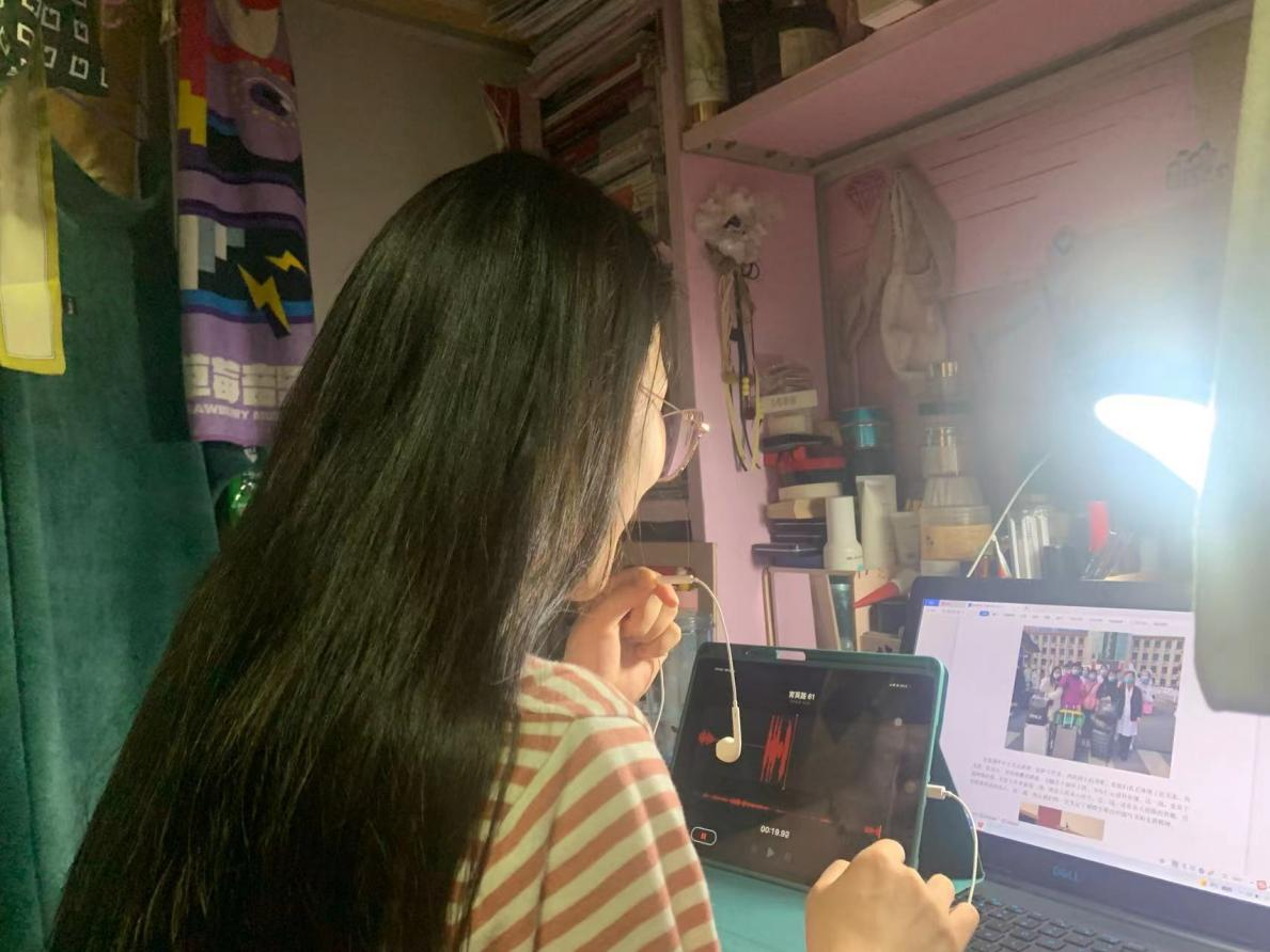 参与录制的学生宋泽华说:“在西安封城的第5天,我收到老师的通知参与央广网录制“疫”线声音的消息。这对我来说是一个很好地锻炼机会,也是我们大学生为抗击疫情做出的一点点努力。因为疫情,我们没有办法在录音棚录音,宿舍录制条件不好,于是我采用最“传统的方法”身上披着棉被进行录制,这样以来收音效果相对有所好转,杂音也会减少,每录完一遍大脑都觉得缺氧,但我想到在一线不畏寒冬冲锋在前的“白衣战士”,我还是调整好状态继续发声,用最好的状态传递声音。”