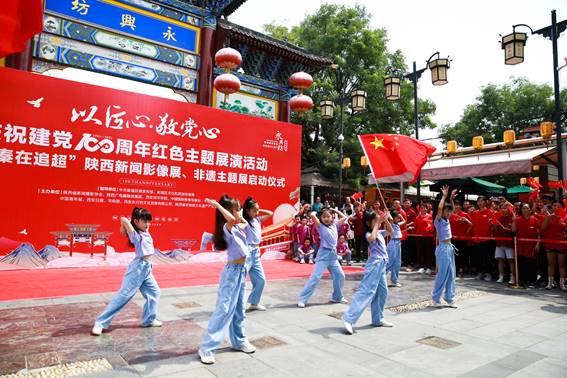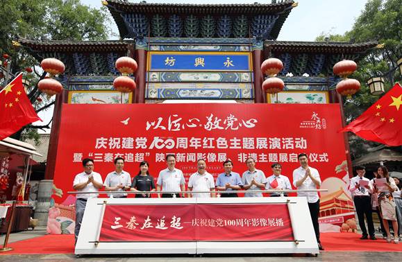 2021年6月30日上午,“三秦在追超——庆祝建党100周年影像展播”首站展播走进西安永兴坊。来自省、市、区相关部门领导、企事业单位、高等院校、行业协会、非遗传承人、媒体等约500余人参加了本次活动。