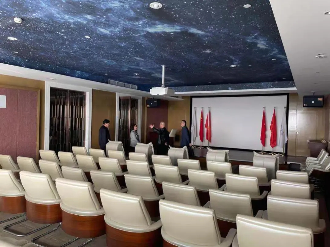米尼梦工厂商务总监张兴伟(右二)带领传媒学院教师参观审片室