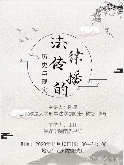 2020年11月10日19:00—21:00,西北政法大学刑事法学院副院长、博士生导师陈玺教授在汇知楼阳光厅以“法律传播的历史与现实”为题做专题讲座。本次讲座由传媒学院主办,传媒学院团委承办。本次活动吸引了传媒学院、人文与国际教育学院、建筑与艺术设计学院、智能科学与信息工程学院、医学院等500余名师生参加,讲座由传媒学院团委书记王朋主持。