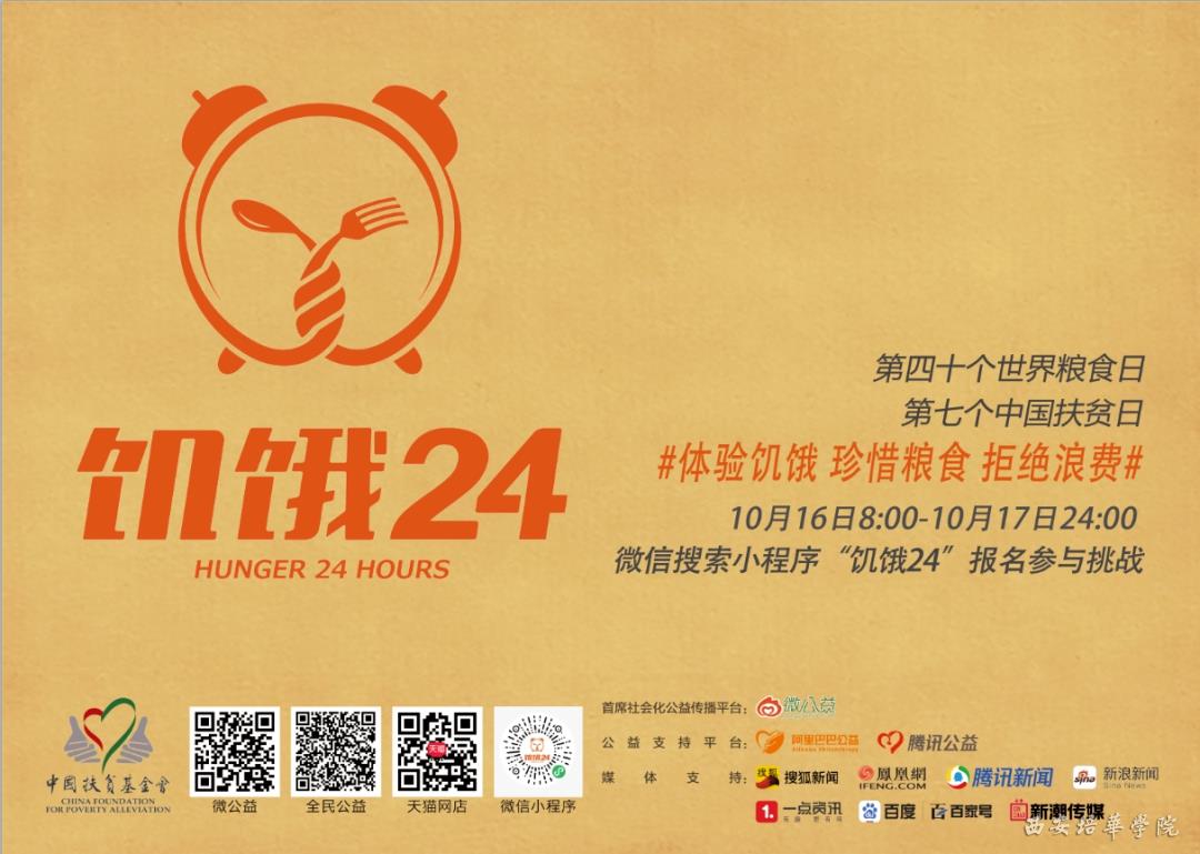 为广泛动员社会公众以实际行动践行节俭节约新风尚,中国扶贫基金会在10月16日(第40个世界粮食日)至10月17日(国家扶贫日)期间,联合新浪微公益、阿里巴巴公益、腾讯公益以及搜狐新闻、凤凰网、腾讯新闻、新浪新闻、一点资讯 、百度百家号、新潮传媒共同发起“饥饿24小时公益体验活动”(简称“饥饿24”)。