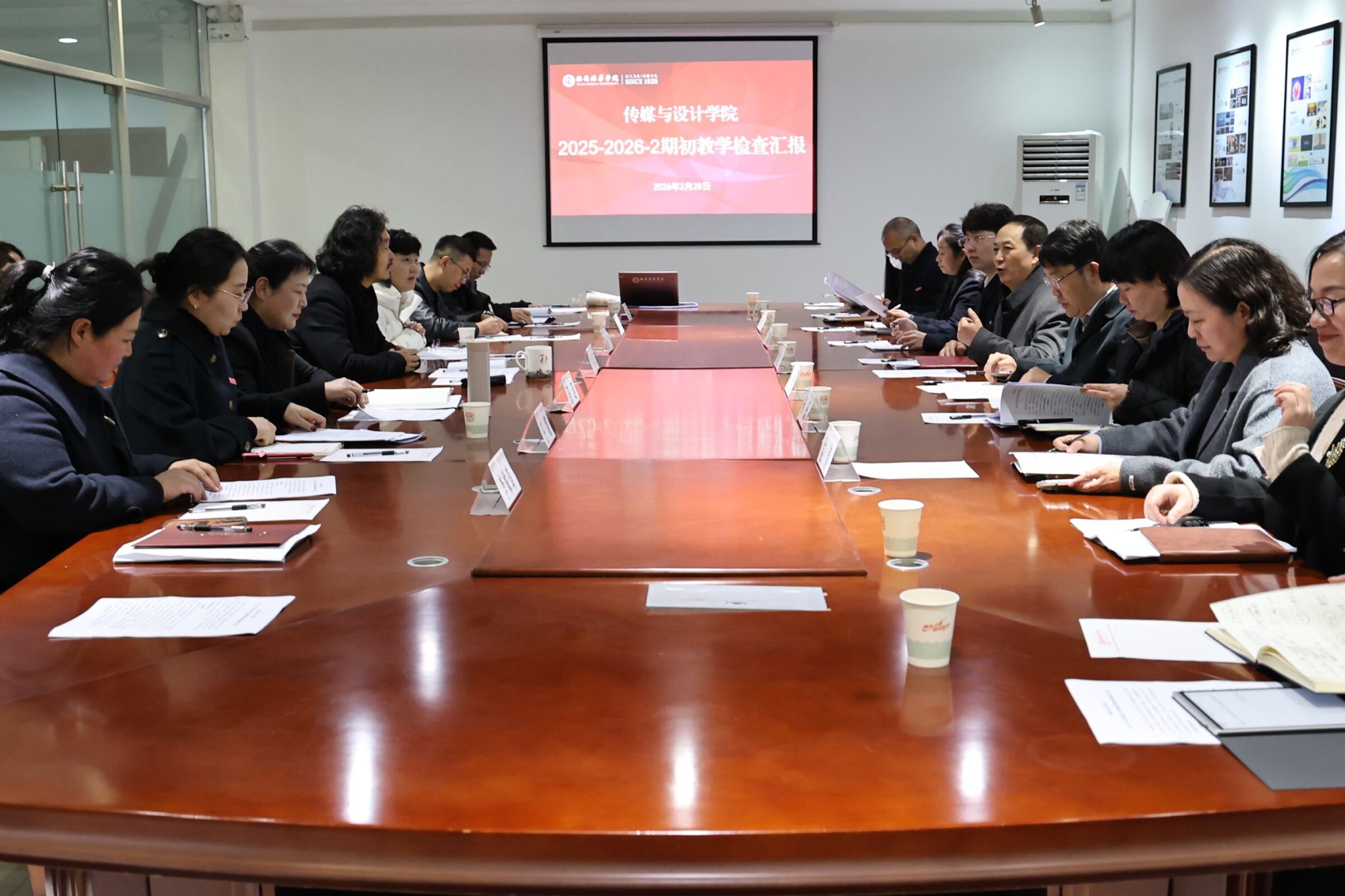 2月28日,传媒与设计学院在汇知楼第四会议室召开2025-2026学年第二学期期初教学检查汇报会。常务副校长胡俊生、副校长姜瀛初、校长助理鲍伟出席会议,教务管理中心主任刘改琳、资产管理中心主任杨蕊、实验室建设与设备管理中心主任刘斌、教务管理中心主任助理孟倩与叶思妤,以及传媒与设计学院院长詹秦川、党委书记兼行政副院长徐莹、教学、科研、产学研副院长邵璐、院长助理王璐、学生一站式服务站长坚强等参加会议。会议围绕传媒与设计学院新学期教学准备情况及学校重点任务展开深入研讨。