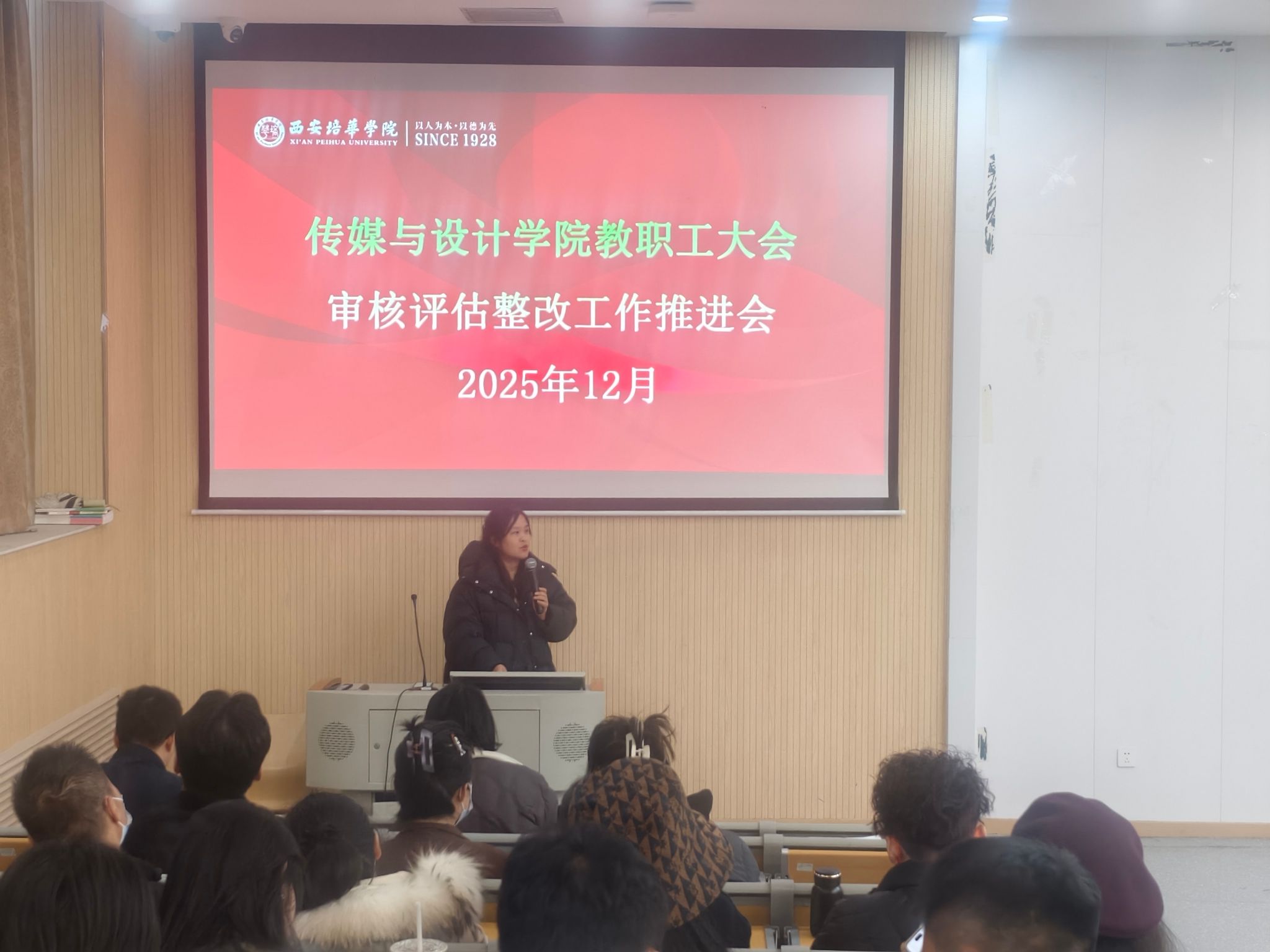 为全面落实本科教育教学审核评估整改要求,切实巩固整改成效、确保成果经得起检验,2025年12月3日17:00,传媒与设计学院在育英楼3507室召开全体教职工大会,专题部署本科教育教学审核评估整改总结及下一步规划相关工作。学院党委书记王飞主持会议,领导班子成员及全体教职工参会。会议要求全院形成工作共识、压实工作责任,深化工作整改,推进教育教学高质量发展。