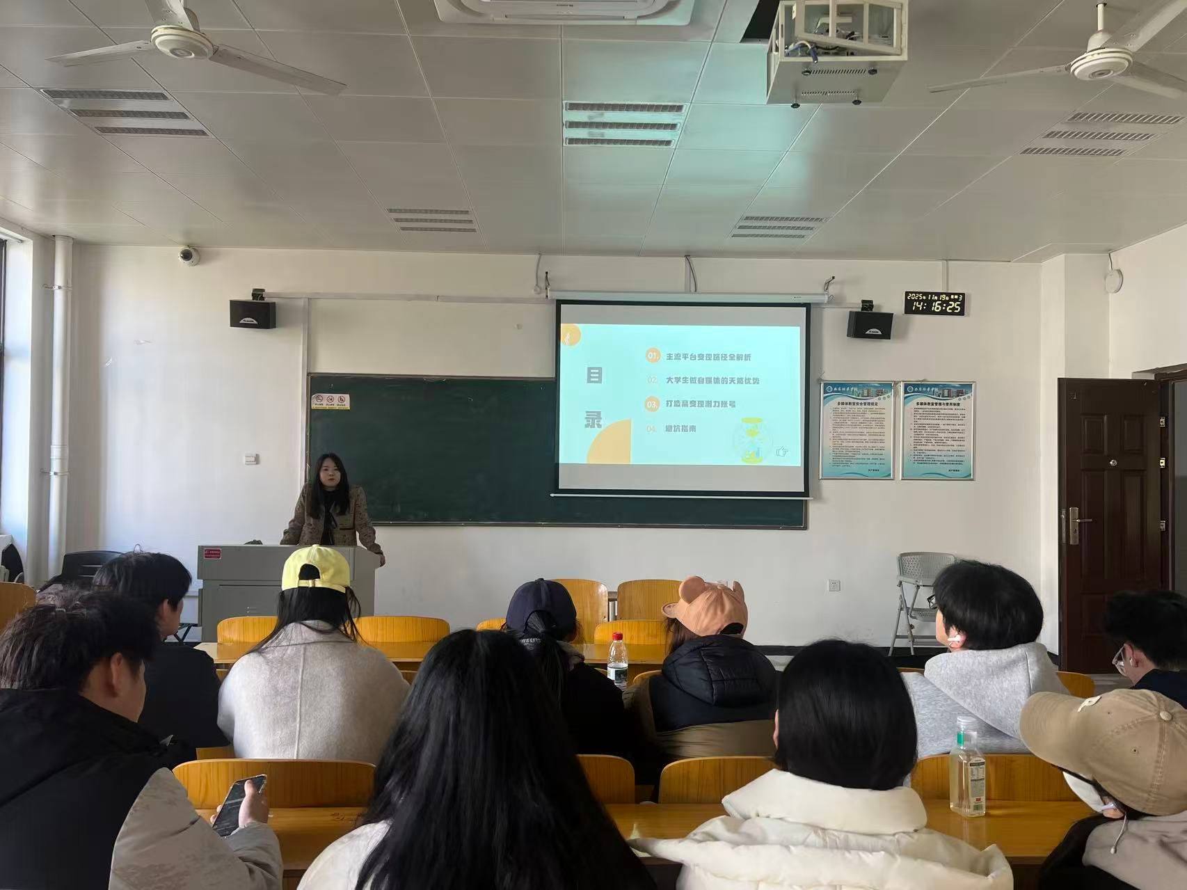 实战训练与指导过程中,金老师围绕自媒体商业化全链条展开系统分享。在主流平台变现路径解析环节,金老师聚焦抖音、快手、视频号、小红书、B站五大低门槛高适配平台,详细拆解各平台流量逻辑与变现模式,抖音的多元带货与广告合作、快手的“老铁经济”与分销佣金、视频号的私域转化与社交裂变、小红书的专业价值变现与品牌合作、B站的付费内容与会员分成,用具体数据对比不同平台的适配内容与收益潜力,帮助学生精准匹配个人定位。