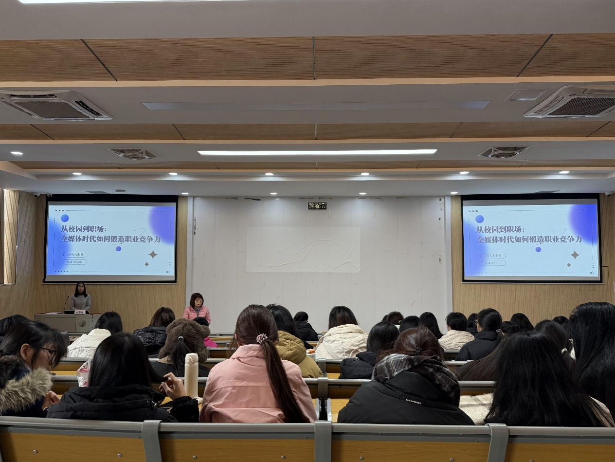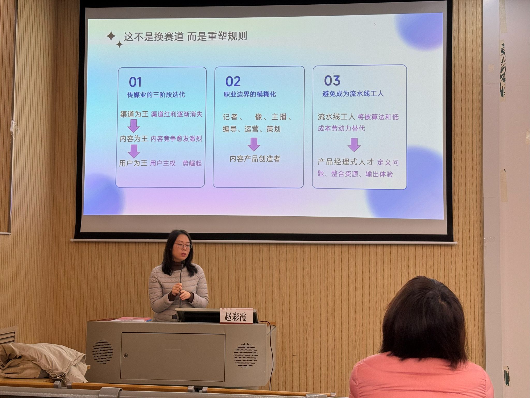 讲座中,赵彩霞编辑从媒体融合时代行业规则的重写切入,引导学生重新定义职业稳定性的内涵,强调持续学习和适应能力才是新时代的“铁饭碗”。她结合自身丰富的业界经历,系统讲解了新闻传播学子应如何构建核心能力体系,包括内容创作、多媒体技术运用、数据思维及跨界沟通等关键技能,并分享了从简历准备到面试环节的实用求职策略。整场讲座内容充实、案例生动,为同学们在媒体融合背景下的职业规划与能力提升提供了清晰路径和宝贵建议。现场互动积极,反响热烈。