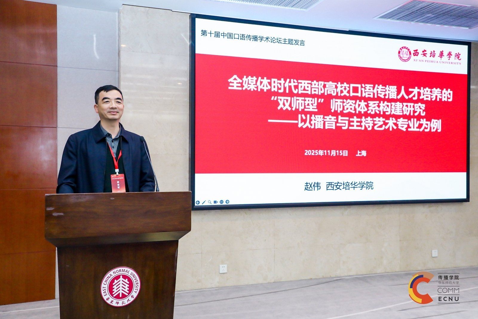 2025年11月15日,第十届中国口语传播学术论坛在华东师范大学圆满落幕。我校传媒与设计学院赵伟教授应邀出席,并以《全媒体时代西部高校口语传播人才培养的“双师型”师资体系构建研究》为题发表主题演讲,向全国兄弟院校展示了我校在播音与主持艺术专业人才培养方面的创新成果。