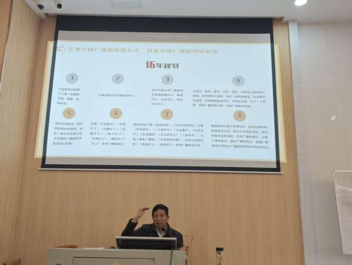 殷满仓老师围绕广播剧创作的核心要素展开系统讲解,从故事梗概构思、人物小传塑造到剧本对白打磨、场景转换设计,全方位拆解了广播剧从策划到落地的完整流程。专家以5分钟微短剧《打酱油》为例,深入剖析了如何用精炼叙事承载沉重主题——作品通过山村少年因打酱油被抓壮丁、四十年后终圆梦的故事,以小见大传递和平愿景,让在场学生直观感受到广播剧“以声传情、以小见大”的独特魅力。