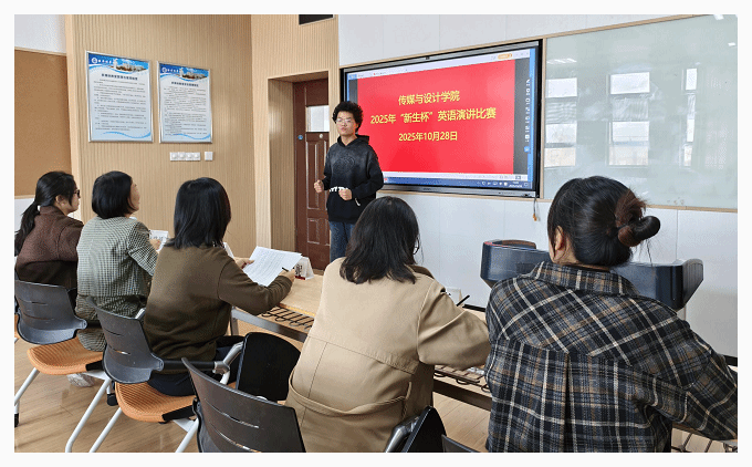 2025年10月28日下午,传媒与设计学院2025年度“新生杯”英语演讲比赛在6510教室隆重举行。这场专为新生量身打造的语言盛宴,不仅点燃了同学们探索英语世界的热忱,更致力于锤炼学生的英语口语表达精度与逻辑思辨深度,为怀揣梦想的新生们搭建起一个展示自我风采、突破成长边界的平台。