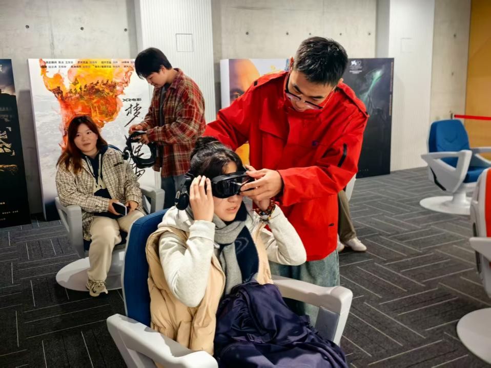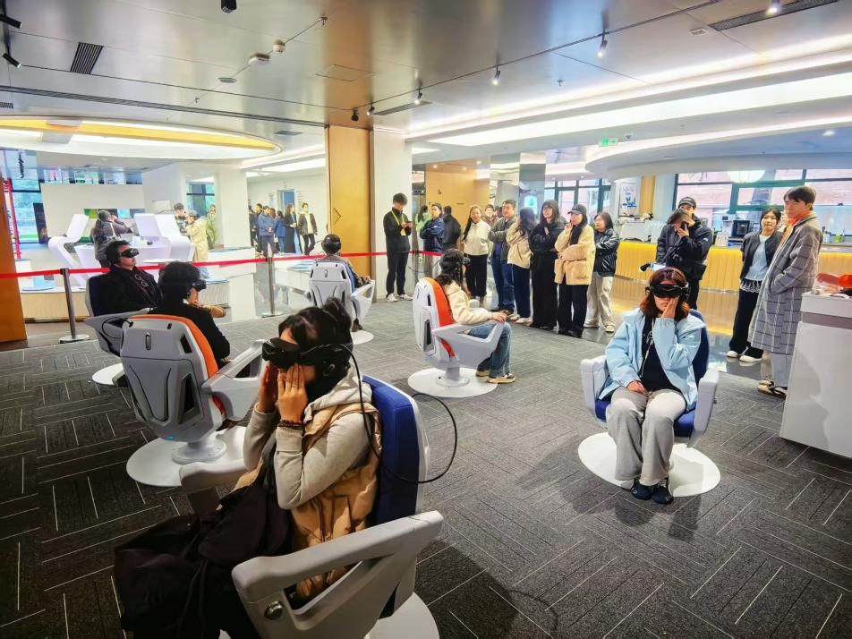 在XR电影产业基地工作人员的引导下,师生们先后参观了坐观式内容测评实验室、VR技术体验区及动作捕捉体验区等核心功能区域,全方位了解影视科技的应用场景与发展态势。