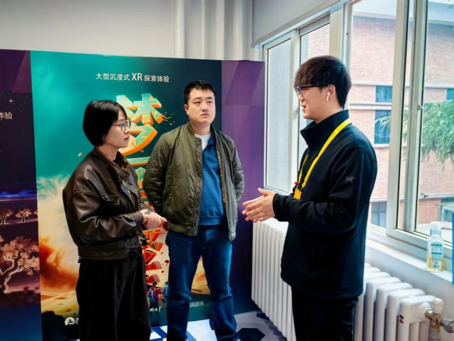 在坐观式内容测评实验室中,师生在现场工作人员的带领下,分组体验了影像技术内容,直观了解该技术给予的视听感受。在VR技术体验区,师生们戴上专业设备,瞬间"置身"于虚拟空间,直观体会到VR技术在影视叙事中的沉浸感以及塑造能力。而在动作捕捉实验室,通过现场志愿者演示,学生们直观的在显屏中看到实时动作反馈,对此表现出浓厚的兴趣,主动同工作人员请教动作捕捉精度优化、数据后期处理等专业问题。