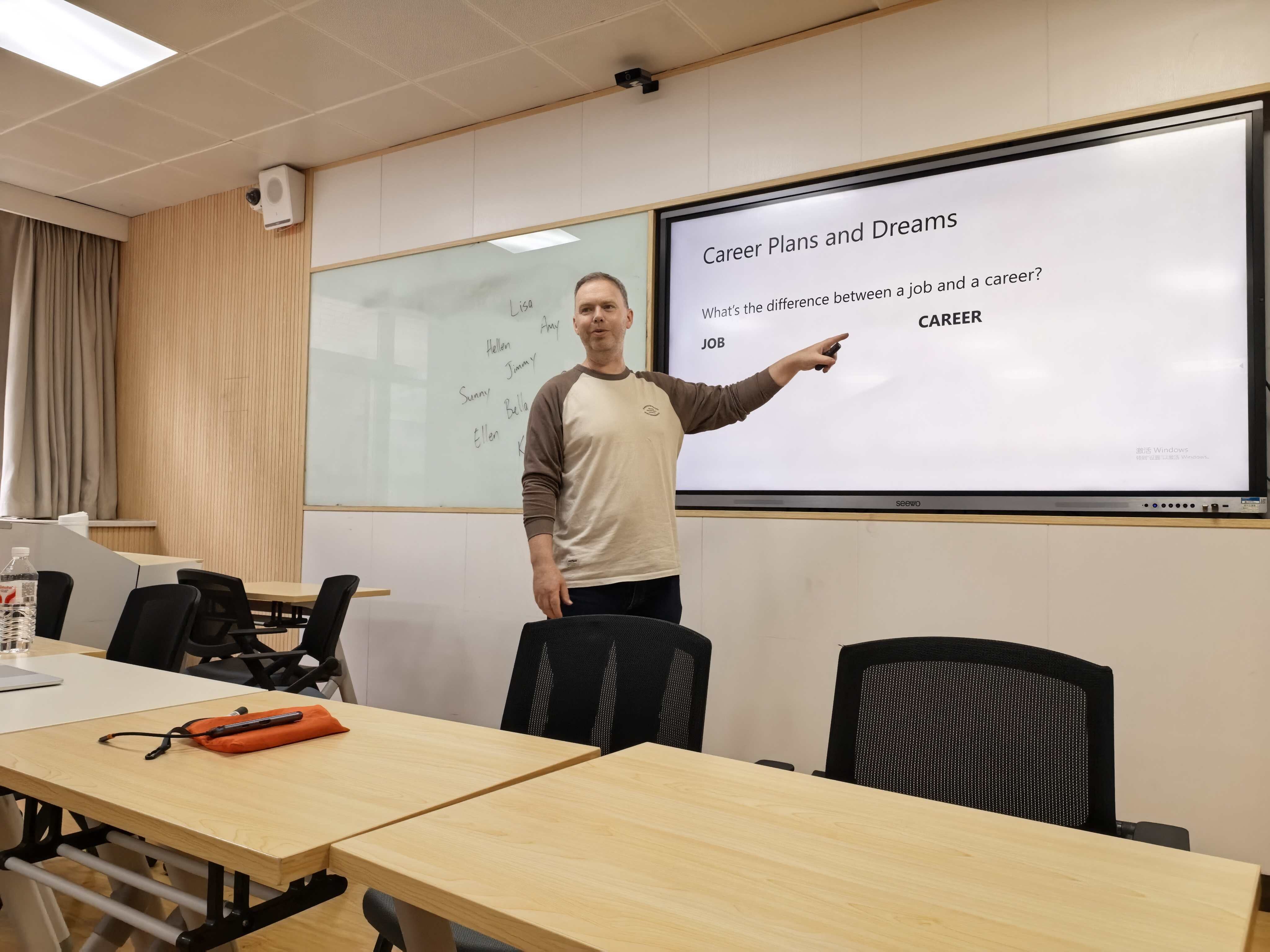 活动伊始,Gary让每位同学进行自我介绍。以问题“What is the difference between a job and a career”(工作与职业的区别是什么?)点燃现场气氛,随后他从全球经济发展和科技变革的宏观视角出发,深入剖析未来职场的发展趋势。他指出,在人工智能、远程协作和全球化深度融合的背景下,未来的工作将更加注重“可转移技能”,如批判性思维、创造性解决问题的能力、跨文化沟通能力及情感智能等。