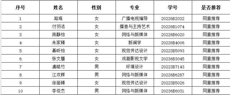经学生个人申请、学院学生资助工作小组初审及公开答辩等环节,最终拟推荐路瑶等10名同学作为传媒与设计学院2024-2025学年国家奖学金候选人,现将名单予以公示(排名不分先后):