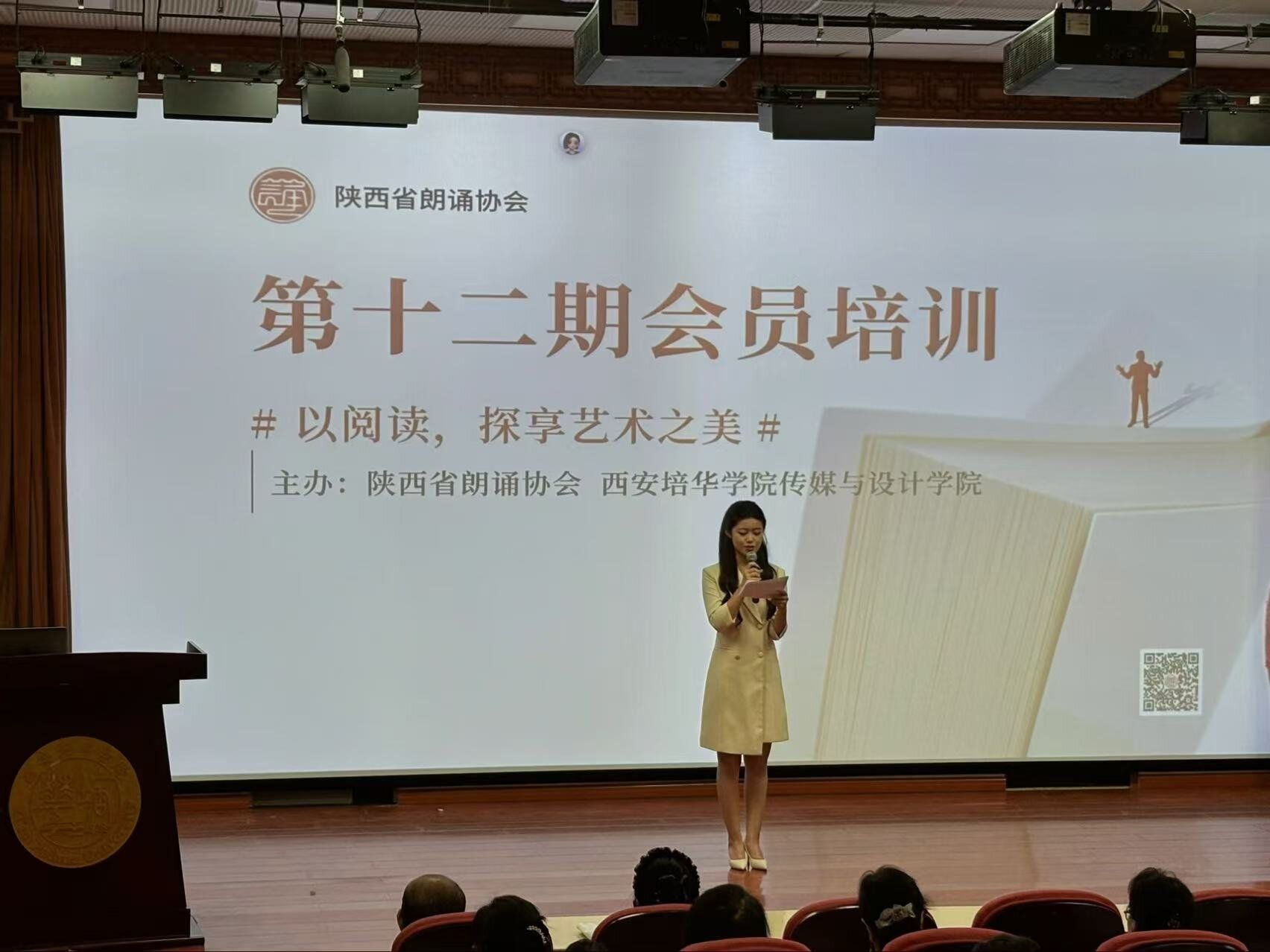 在第28届全国推广普通话宣传周开展之际,为以朗诵艺术实践深化国家通用语言文字推广,9月13日,由陕西省朗诵协会与西安培华学院传媒与设计学院、大学生朗诵艺术团联合主办的第十二期会员公益艺术培训,在西安培华学院汇知楼国学大讲堂圆满举行。本次培训以“提升朗诵艺术素养”为核心,既是推普周“推广规范普通话、弘扬语言艺术”的具体行动,更依托西安培华学院播音与主持艺术专业的学科优势,构建了“校协协同、专业引领、实践育人”的语言艺术培养平台。陕西省朗诵协会副会长文涛,西安培华学院播音与主持艺术系主任尚勇,大学生朗诵艺术团负责人黑梦奇出席活动,2024级播音与主持艺术专业学生,大学生朗诵艺术团骨干成员孙兴宇主持。