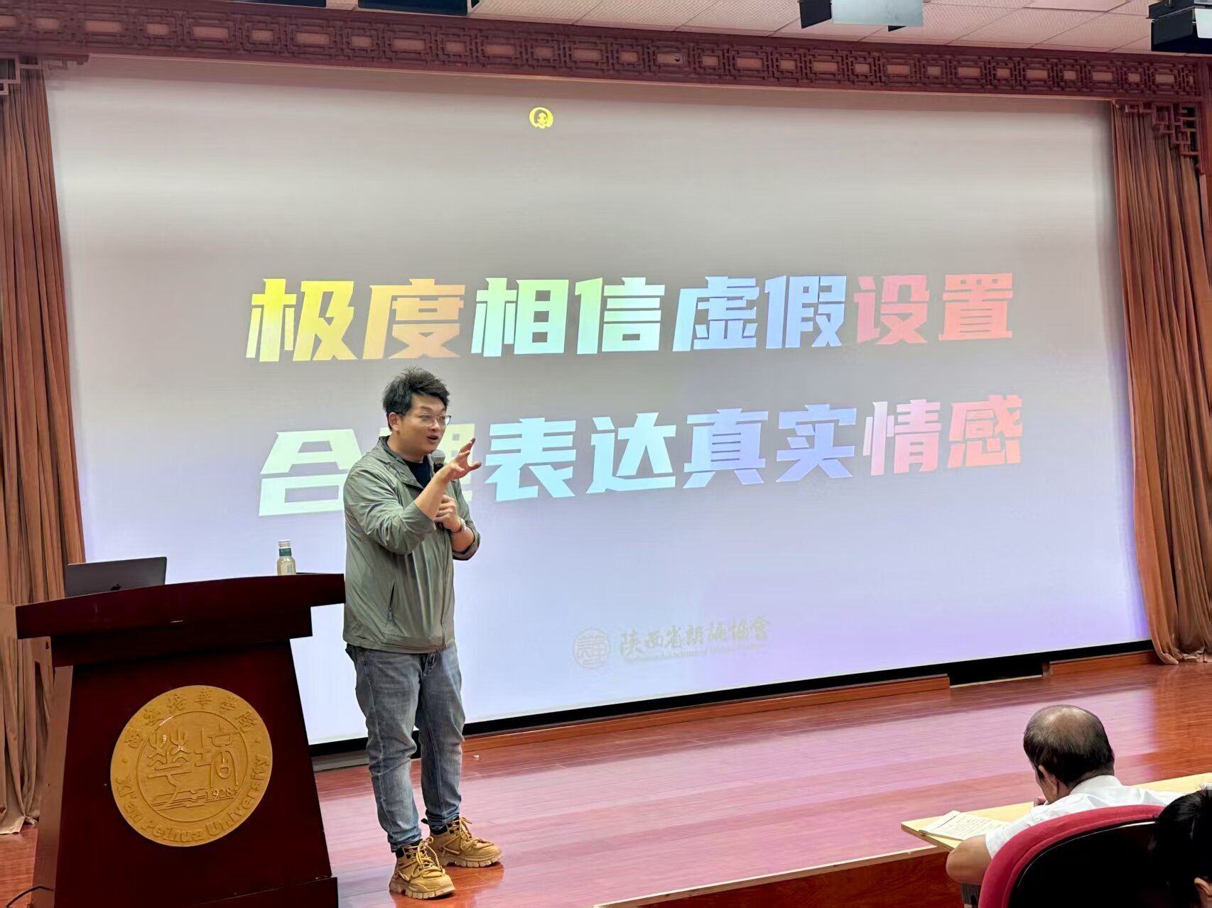陕西省朗诵协会理事、西北大学播音与主持艺术专业双师型导师、青年配音演员李政良,以《声音艺术中的审美与声音质量》为题授课。课程紧扣推普周“规范发音、提升语言表现力”要求,结合其配音实践经验,从声音清晰度、质感、感染力三大审美维度,讲解“如何通过标准普通话让朗诵更具传递力”——既纠正平翘舌混淆、前后鼻音不分等常见问题,也指导如何依据文本风格调整音色、控制气息。