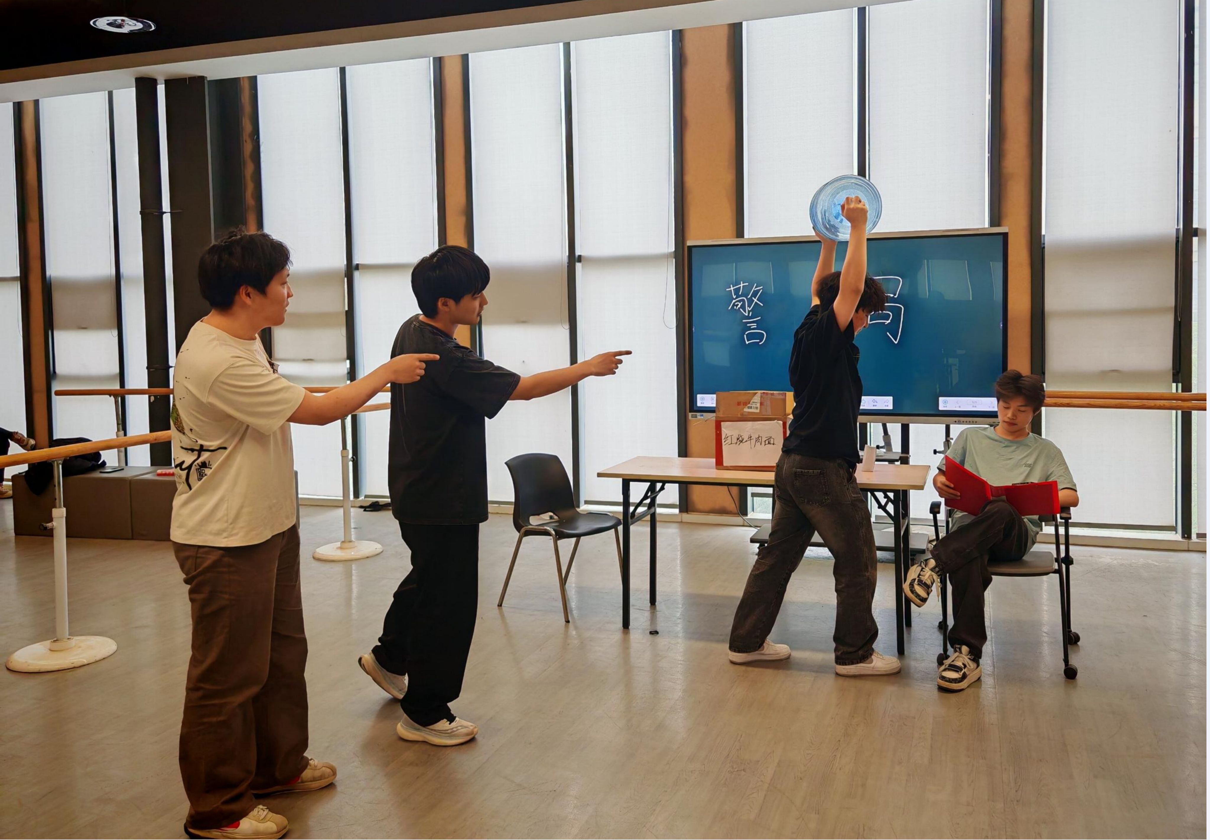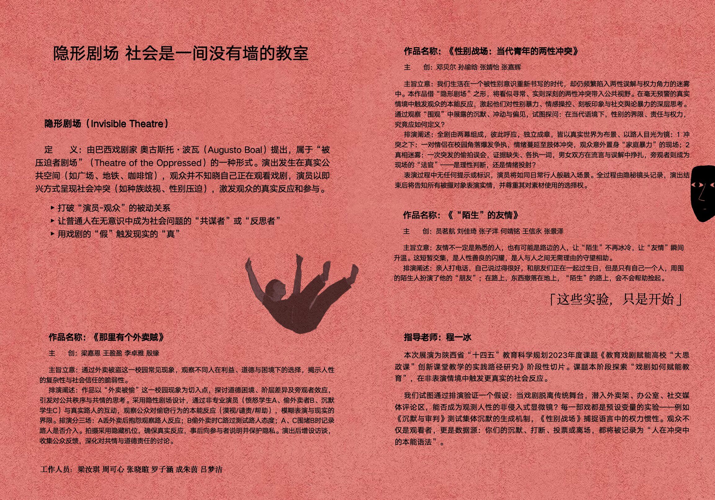 本班汇演是指导教师程一冰主持的陕西省“十四五规划课题《教育戏剧赋能高校"大思政课"创新课堂教学的实践路径研究》的阶段性成果。课题组通过"戏剧工作坊+思政教育"的融合模式,将社会议题创作转化为生动的戏剧课堂,使学生在编排过程中实现艺术创作与价值引领的同频共振,彰显戏剧艺术介入现实的锐度与温度。