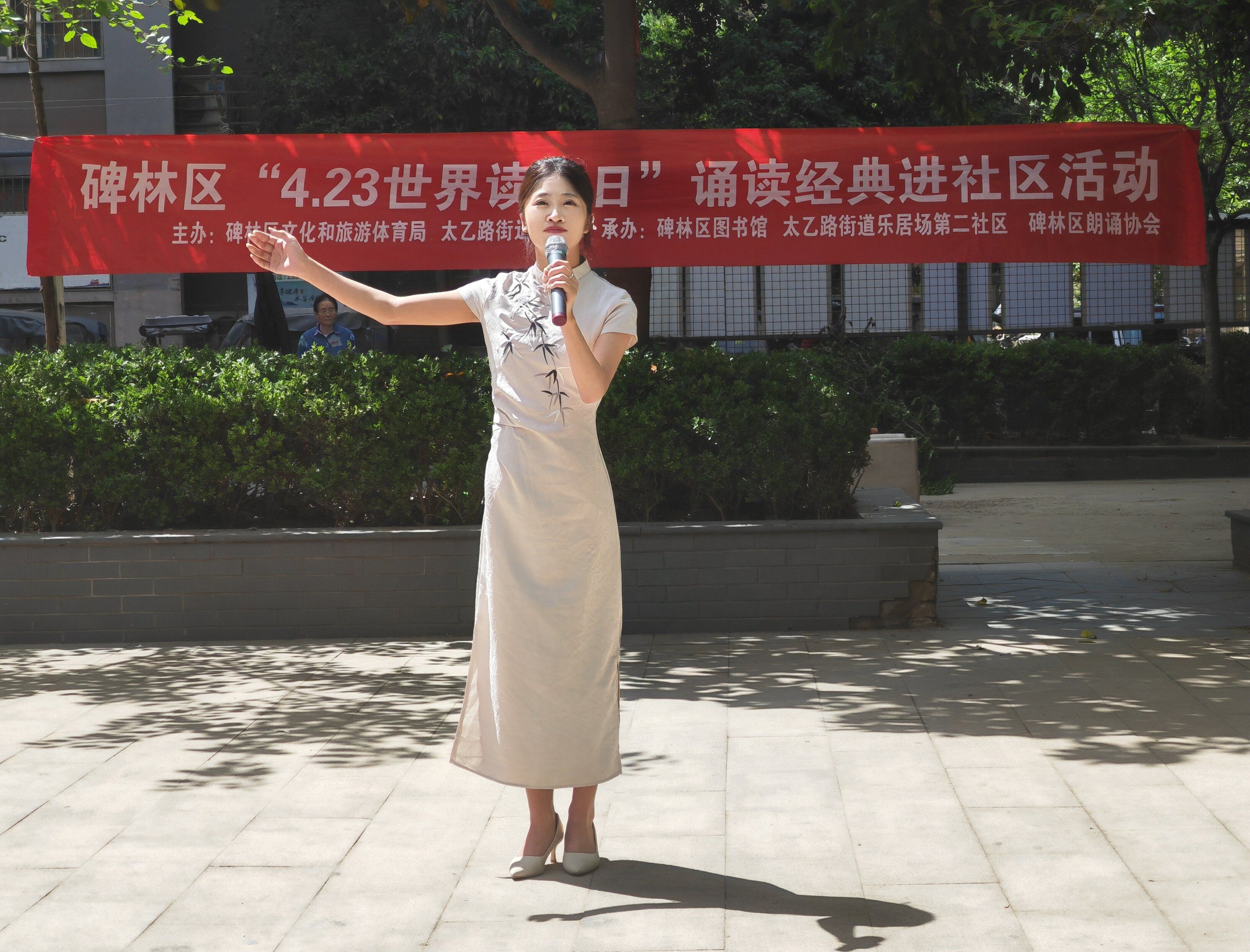 在乐居场小区,西安培华学院传媒与设计学院播音与主持系2023级学生王程昊在肖雪菁老师指导下,以青年之声诠释革命年代的赤子情怀。王同学舒缓的语调如微风轻拂红土地,温柔地揭开那段尘封的爱情故事,用细腻的声音描绘着恋人之间的柔情蜜意,每一个音节都饱含着深情。许多居民听得热泪盈眶,被这跨越时空的爱情深深打动。她精准的气息控制、细腻的情感层次处理,展现了“00后”对红色经典的全新解读。