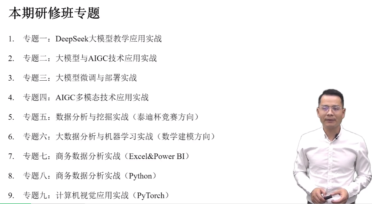 本次课程历时11天,聚焦“实战”主题,涵盖大模型原理、提示工程、AI绘画、文生视频、语音克隆、虚拟数字人等十大模块。老师们通过云课堂进行理论学习后,结合个人PC完成实时操作演练,并通过学习群与讲师高效互动。课程特别引入DeepSeek大模型技术应用,并在AI语音技术专题中详细讲解语音识别、文本生成语音、语音克隆等前沿技术,助力学员掌握从理论到实践的全链路技能。