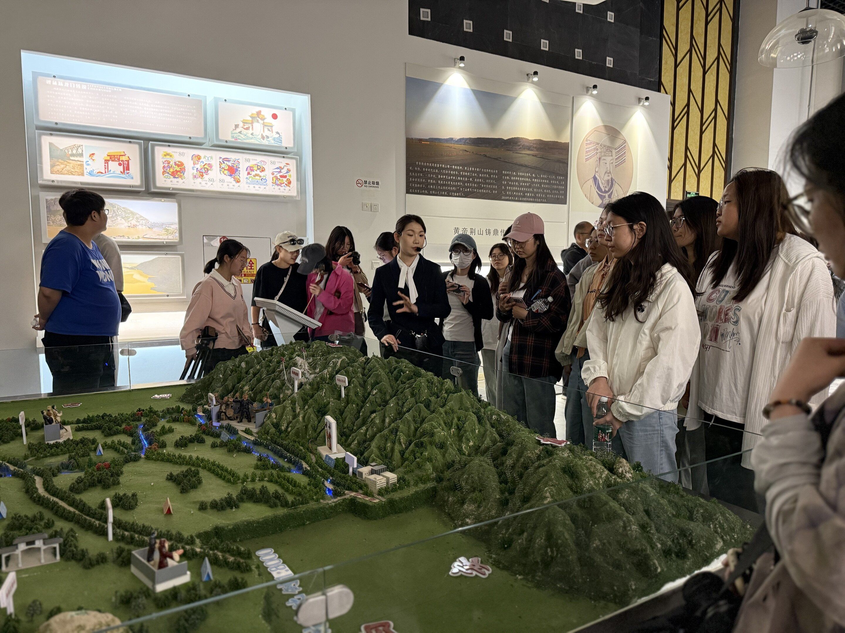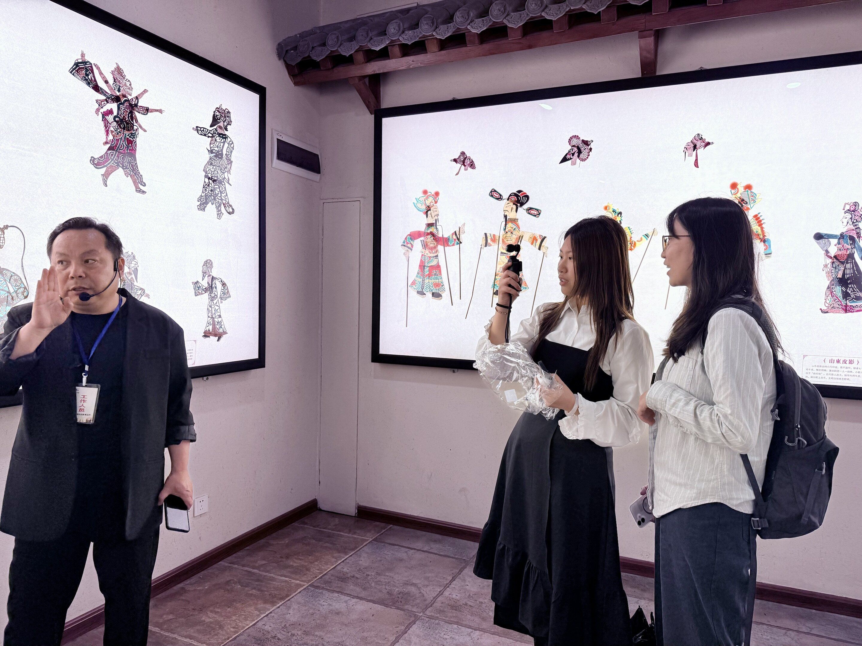 4 月 21 日上午,师生一行抵达皮影博览园。在观摩了《丝路风》《老鼠偷油》等经典剧目后,学生学习如何用镜头展现皮影戏独特的叙事艺术。通过分组讨论,学生尝试将传统皮影戏元素与现代短视频形式相结合,探索新的影像表达方式。下午的玉泉院实践环节中,学生利用自然光线捕捉古建筑之美,探索不同景别和机位的镜头设计。指导教师现场示范,强调画面层次感和设备安全问题,帮助学生在实践中提升拍摄技巧。