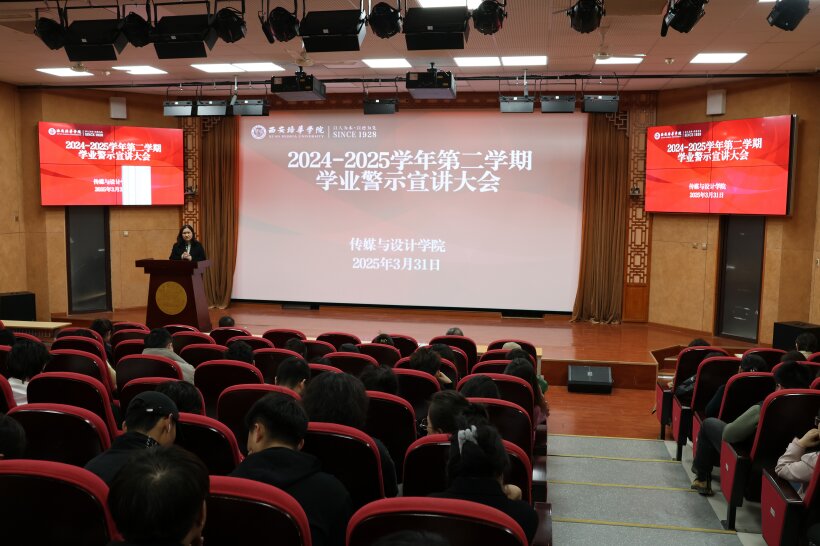 为进一步提高人才培养质量,加强对学生学业的指导,推进学风建设,充分发挥学院、学生、家庭“三结合”教育功能,保障教育教学和人才培养质量,2025年3月31日中午,传媒与设计学院于国学大讲堂召开2024-2025学年第二学期学业警示宣讲大会。参会人员有党委书记兼行政副院长王飞、副院长张荣花、教学科研干事、各专业带头人(负责人)、相关学业导师、学生干事、辅导员及学业预警学生。