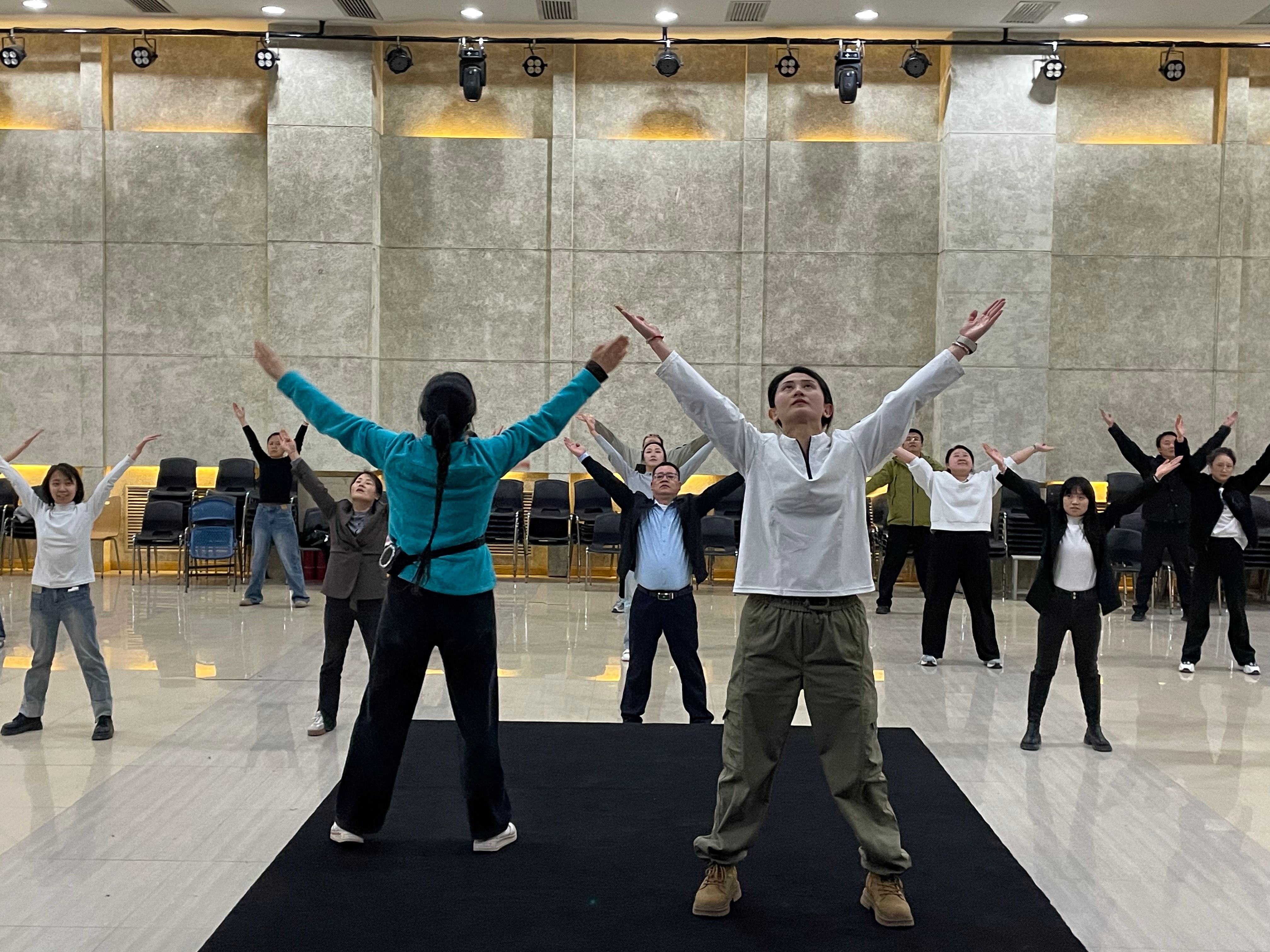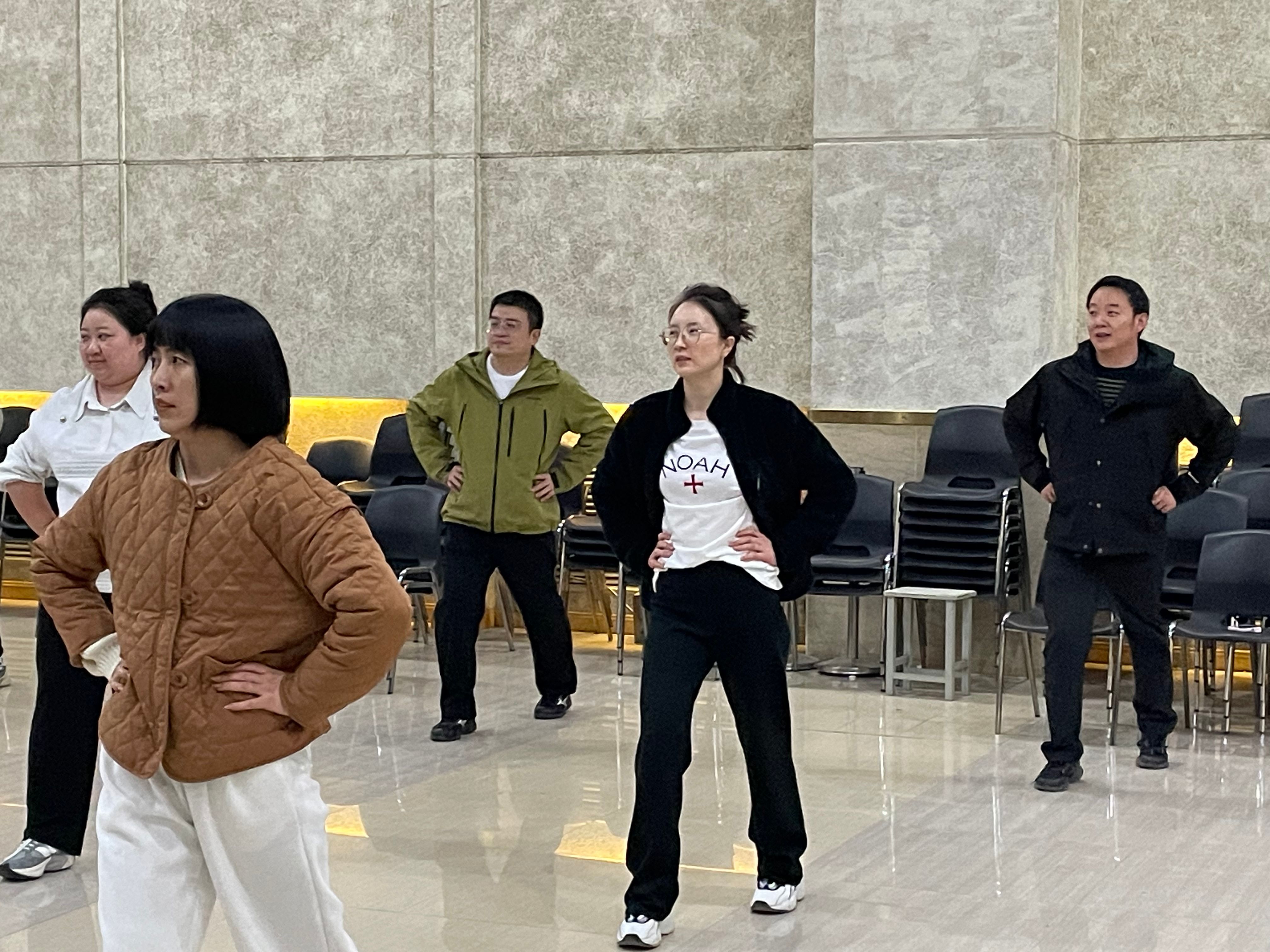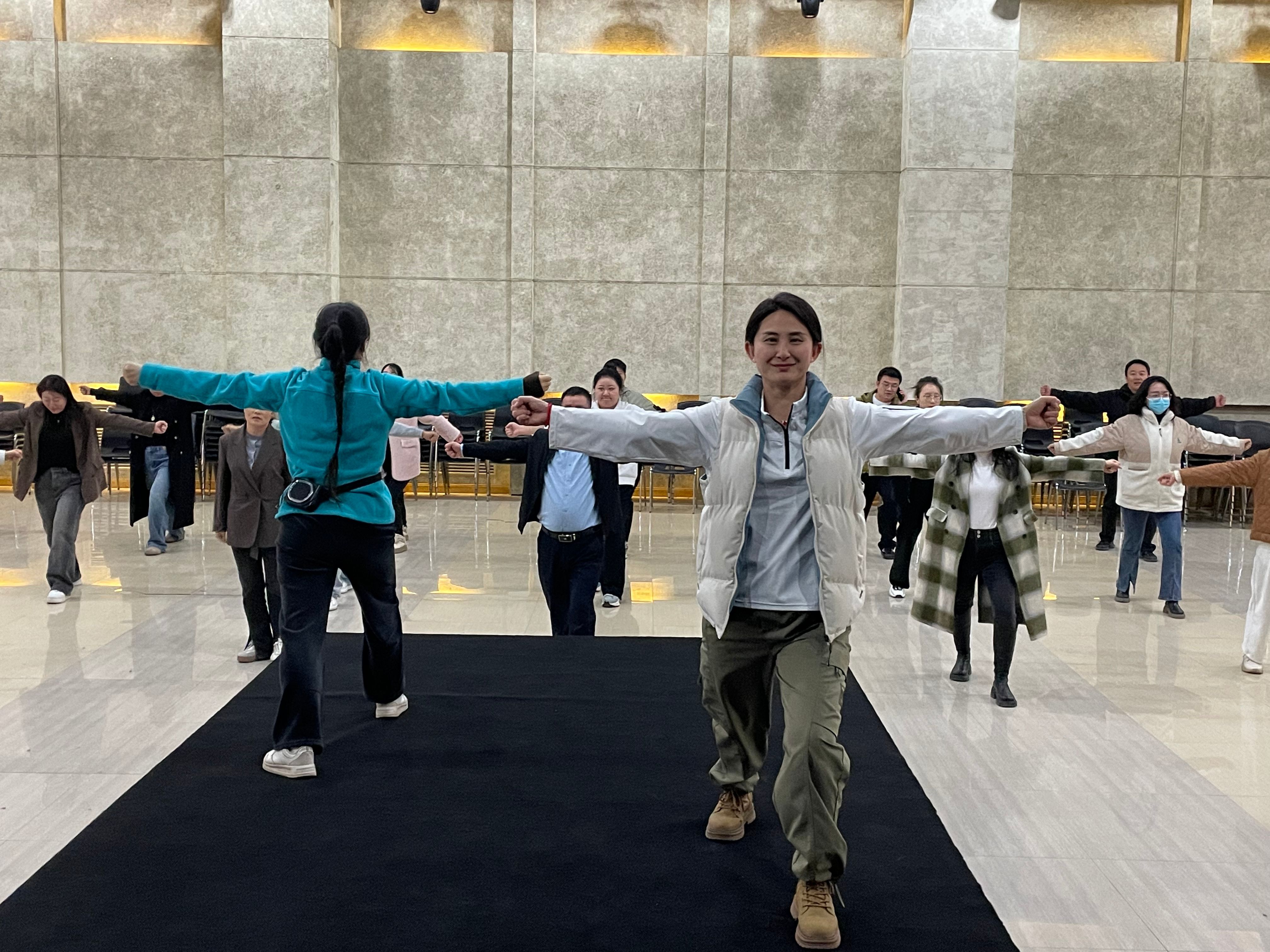 邀请体育学院健身操俱乐部主任陈元香老师、体育专业教师张静老师为辅导员、综合办公室老师教授健身操,共同开展健康打卡。学院党委书记兼行政副院长王飞带头参与,倡导“强健体魄与高效工作并行”的理念,营造全员运动的积极氛围,并鼓励辅导员以身示范,带领学生共同进行体育锻炼,强健体魄。