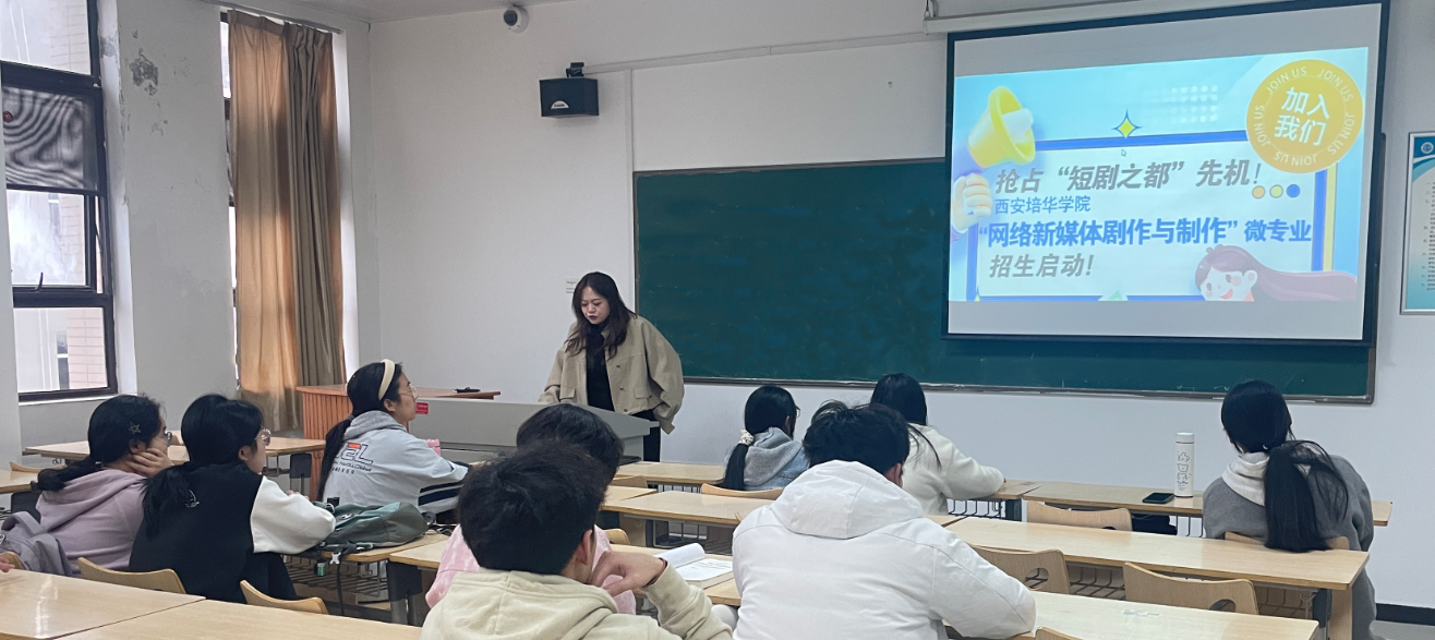 2025年3月,草长莺飞,春暖花开,我校传媒与设计学院迎来了一场别开生面的宣传活动。为助力“网络新媒体剧作与制作”微专业招生,学院的各专业学业导师纷纷走进课堂,进入各个专业班级,向同学们详细介绍这一特色微专业。从戏剧影视文学到网络新媒体,从播音主持到数字媒体艺术,每个优秀的学业导师都倾注了大量心血,耐心讲解、热情互动,整个学院掀起了一股短剧学习热潮!