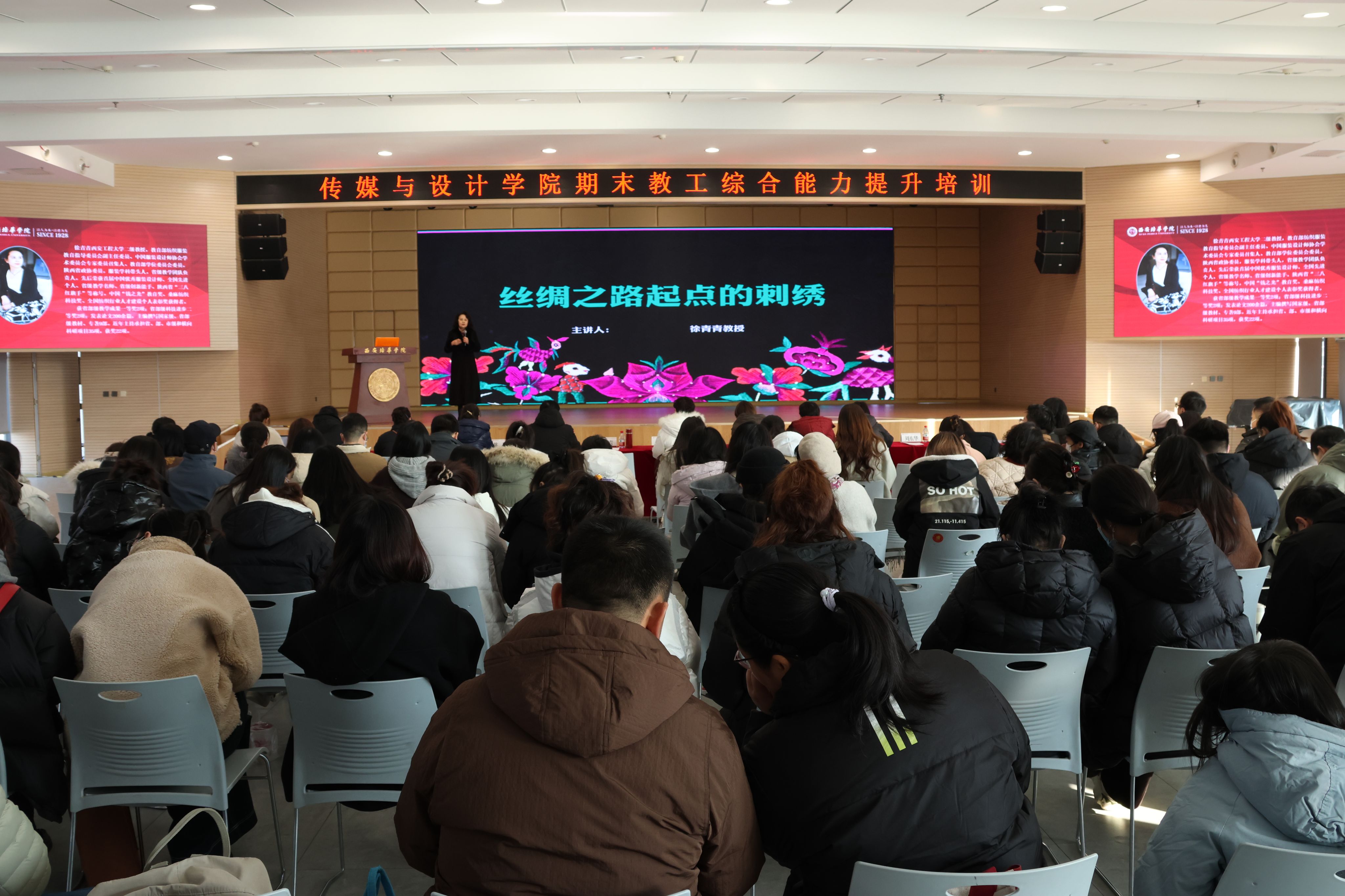 为提升教师的综合素质与教学能力,增强教师们对文化遗产保护与传承的认知,2025年1月16日,传媒与设计学院成功举办了期末教工综合能力提升培训第三场。本次培训的主题为《丝绸之路起点的刺绣》,特邀服装与服饰设计专业徐青青教授主讲。