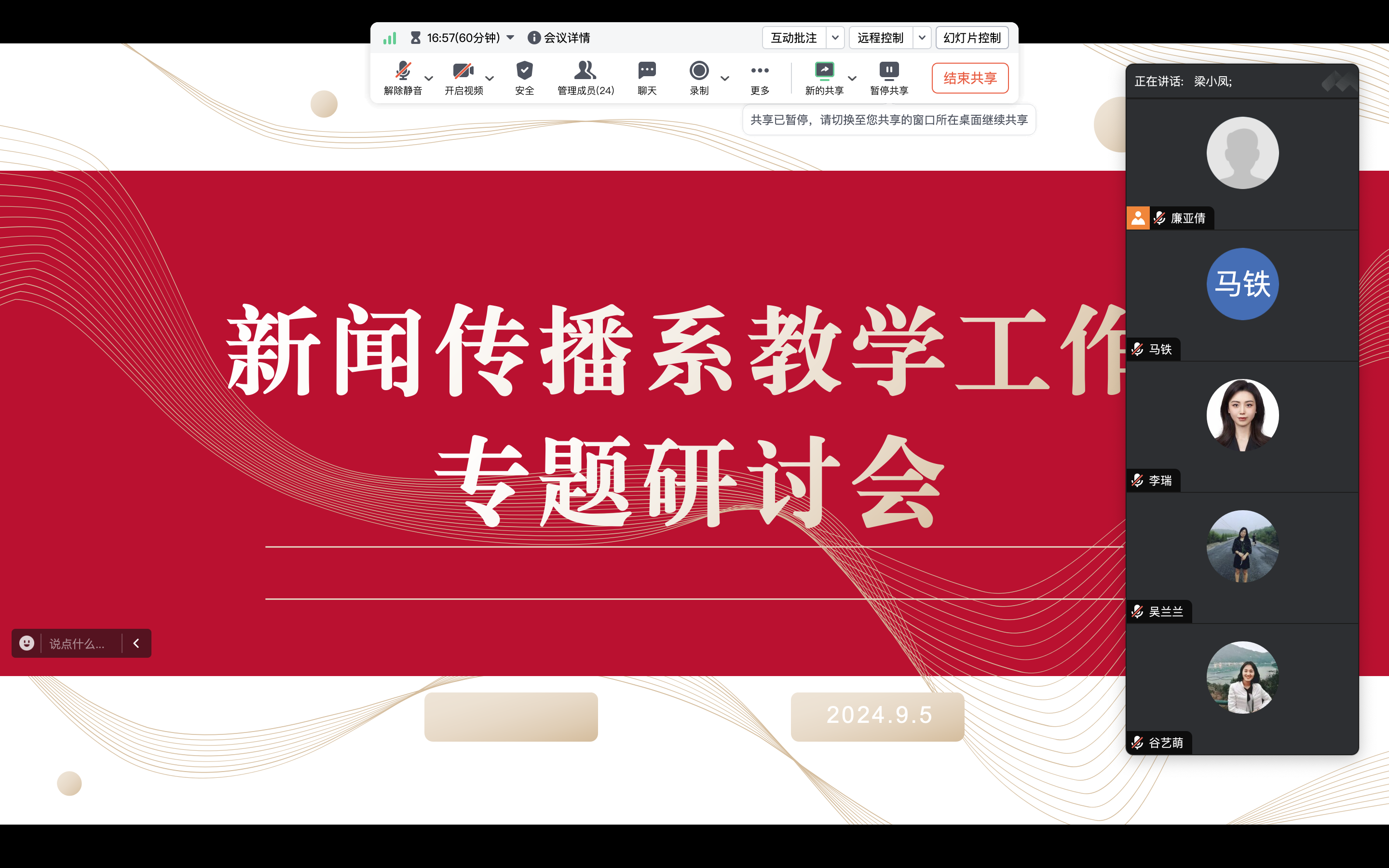 会议伊始,带头人发表了重要讲话,强调了课程思政在当前教育体系中的重要性,并指出网络与新媒体专业教师在培养学生正确价值观和网络素养方面所承担的重要职责。他鼓励与会教师积极探索如何将思政元素融入专业课程,以提高学生的综合素质。