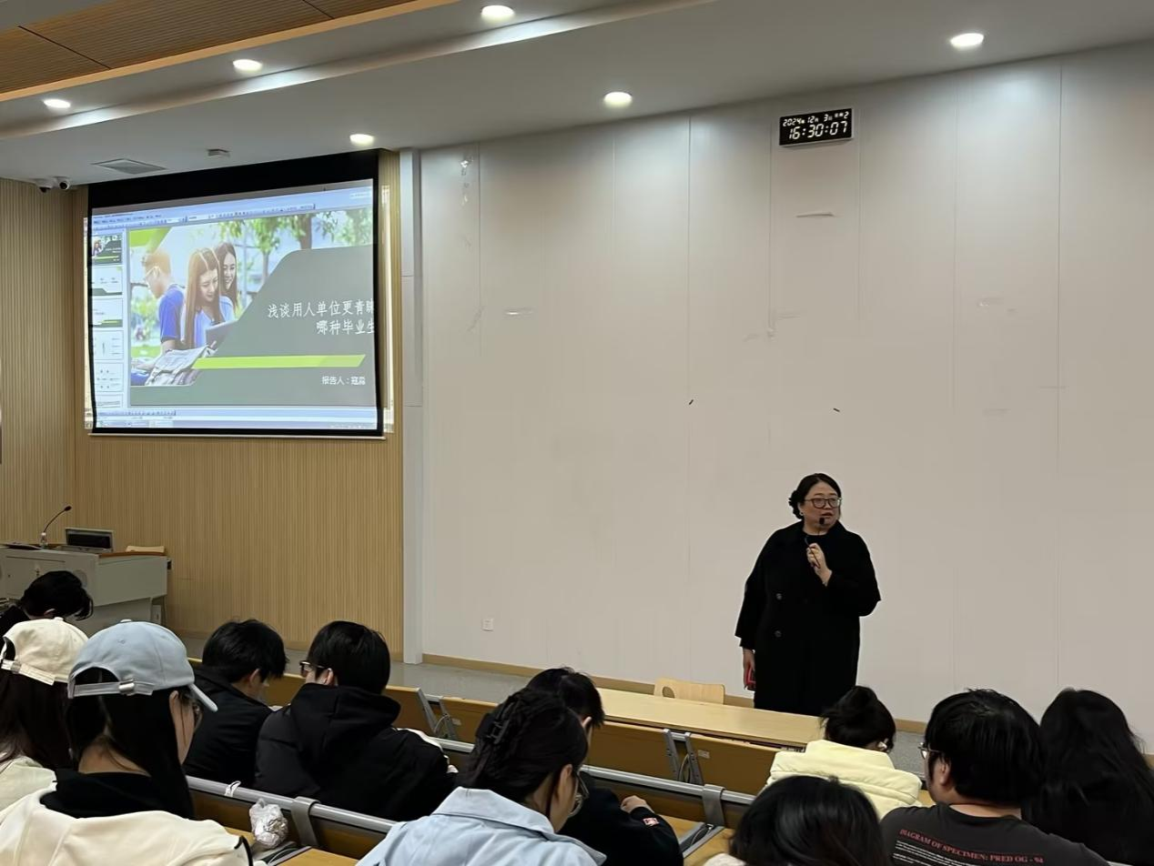 第四场讲座是由青年女性导演、制片人,西安梦想流坊影视文化传媒有限公司创始人,中国电视剧制作产业协会青工委委员寇淼带来的“浅析用人单位更青睐哪种毕业生”主题的讲座分享。讲座以她资深的招聘经验,指出了在校学生提升自身竞争力的关键所在。她强调,企业更倾向于那些具备扎实专业知识、良好沟通能力和团队合作精神的毕业生。同时,她也提醒学生们要注重个人品牌的塑造和职业规划的制定,以便在未来的职场竞争中脱颖而出。
