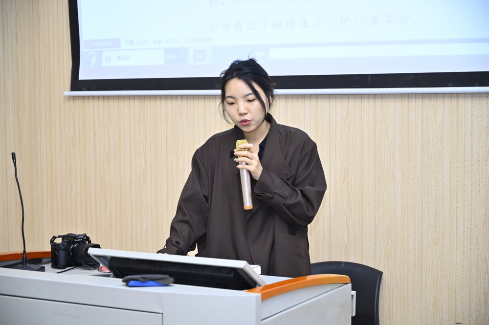 在讲解之初,薛如梦记者以其在新闻工作中的实战经验进行分享。她讲道,在融媒体时代,新闻工作者不再仅局限于写新闻稿件,还要提高自身的策划能力,擅于捕捉热点事件,并不断锻炼自身的新闻敏锐度。随后,她展示了策划的“寻百强·看中国”直播视频节目,并分享策划、摄制经验。