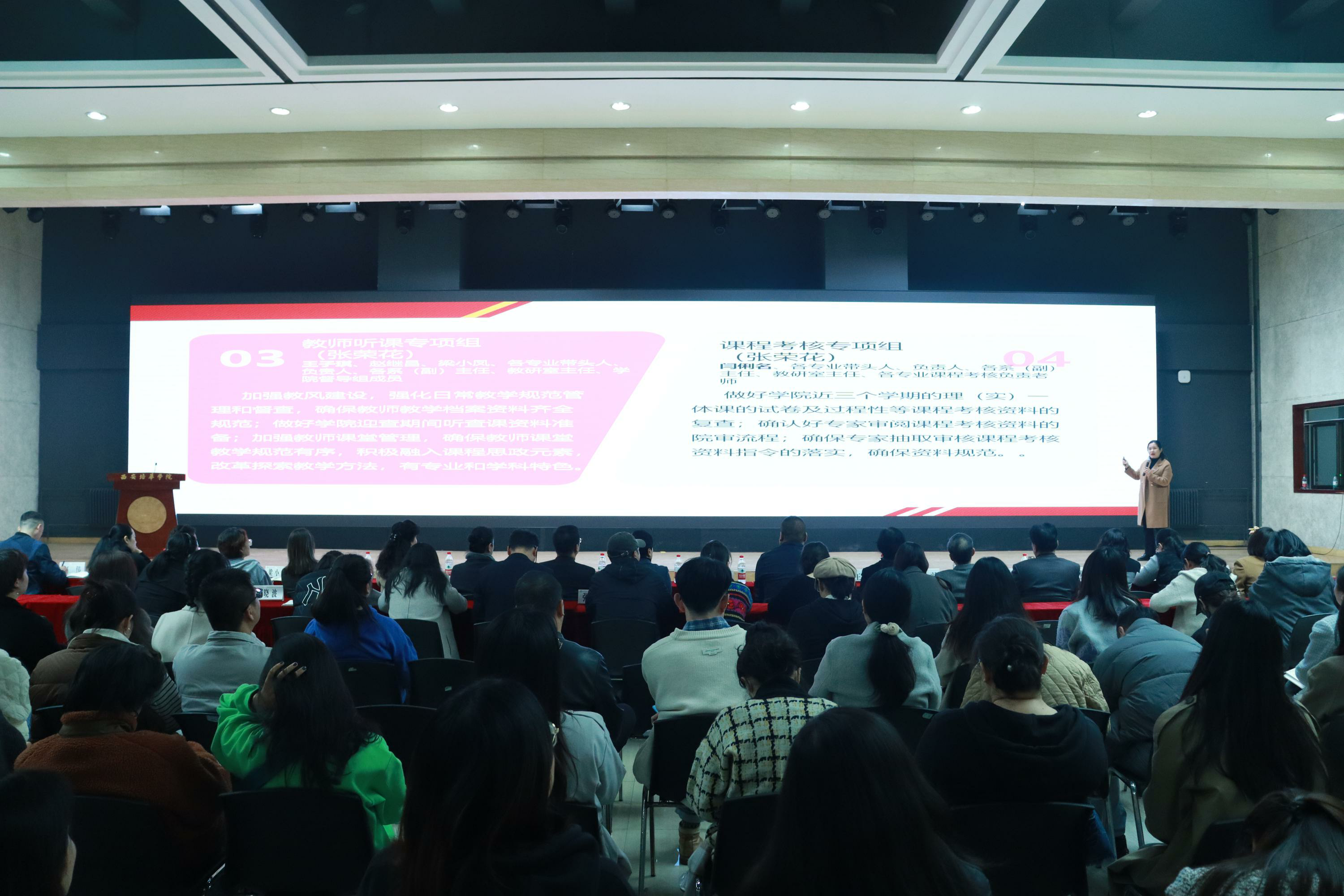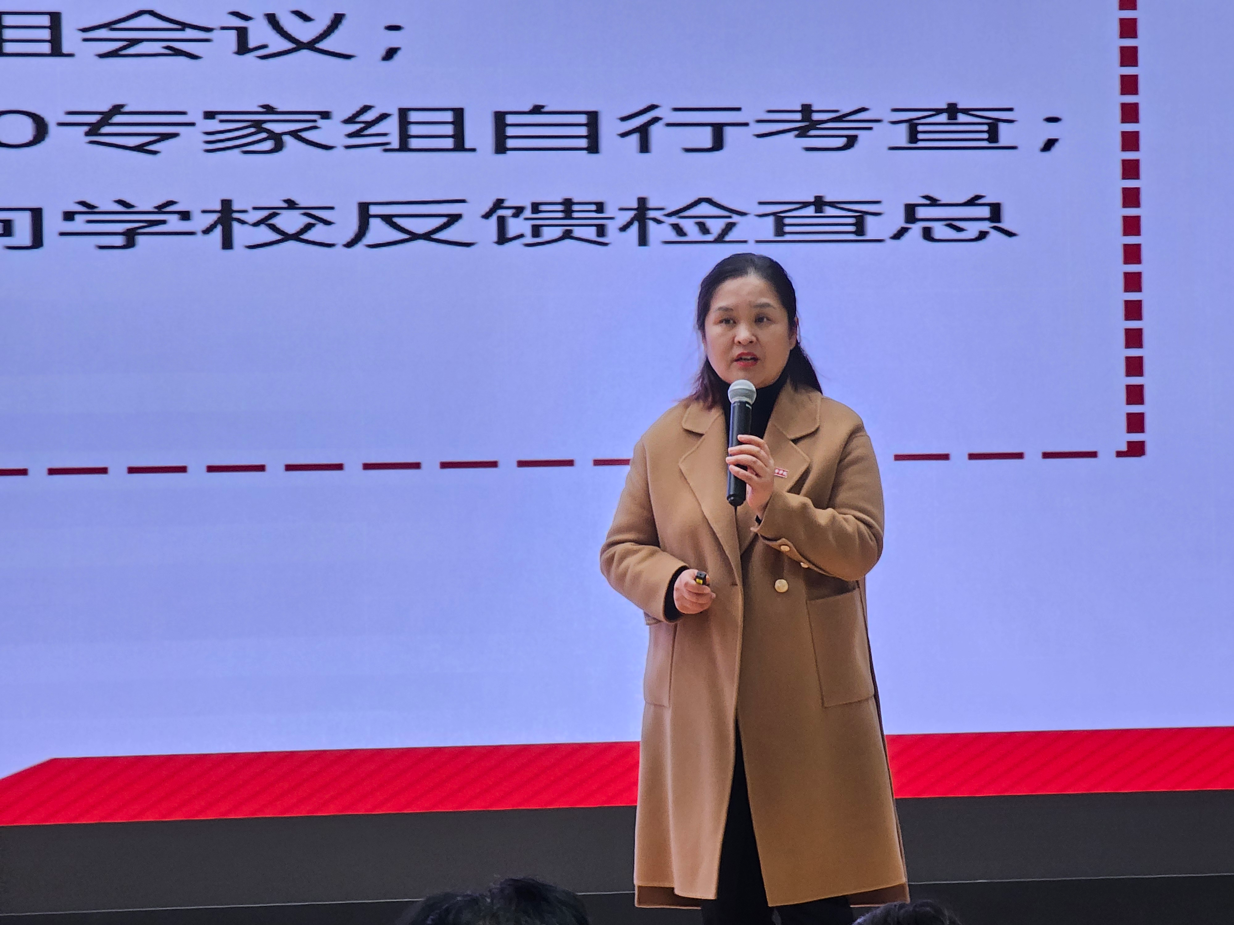 会议开始,由张荣花副院长代表学院领导班子对学院迎接审核评估整改工作中期检查实施方案进行了详细的通报。首先,对学院成立的审核评估中期检查领导小组和9个专项工作小组的人员组成,工作职责,工作流程和工作要求进行详细的介绍。接着她对标审核评估检查任务,对各专业、部门和院领导、专业带头人、负责人、教师、辅导员及行政教辅各类人员提出了具体的工作任务和要求,做到了各项工作责任明确,专人负责。她要求,各部门要“抓好自己的人,守住自己的门”,通力协作,高质量完成各项任务。最后,张荣花副院长传达了李映方校长在学校合作发展与科研推进会上的讲话精神,要围绕一条主线(围绕学校高质量发展为主线);抓住两个转变(项目数量向质量转变;单兵作战向团队合作转变);做到三个结合(产教融合与学科抓也规划相结合;合作发展、科研与教学相结合;合作发展、科研与社会服务相结合);抓好四个重点工作(领军人物和骨干引进培养;高水平科研团队建设;科研创新平台建设;标志性成果培育建设);健全五个机制(科研合作发展激励机制;成果转化与科研服务机制;科研发展交叉融合机制;科研合作发展诚信机制;科研合作发展联动机制),促进学院内涵发展。