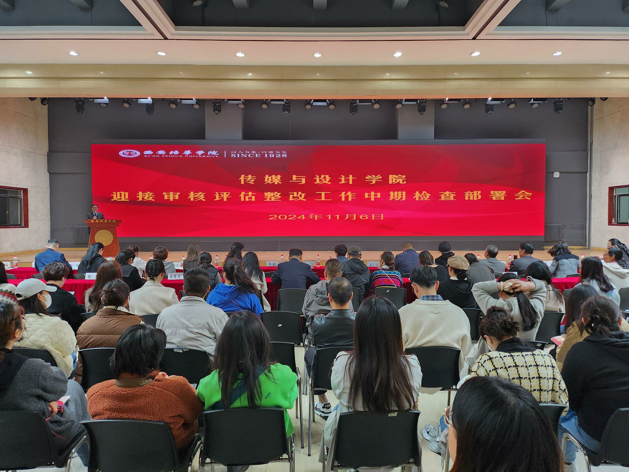 为了进一步落实审核评估中期检查各项工作任务,促进整改,提高学院教育教学工作的高质量发展,11月6日14:30,传媒与设计学院在汇知楼阳光厅召开了学院审核评估中期检查重点工作部署全体教职工大会。会议由学院党委书记兼行政副院长王飞主持。