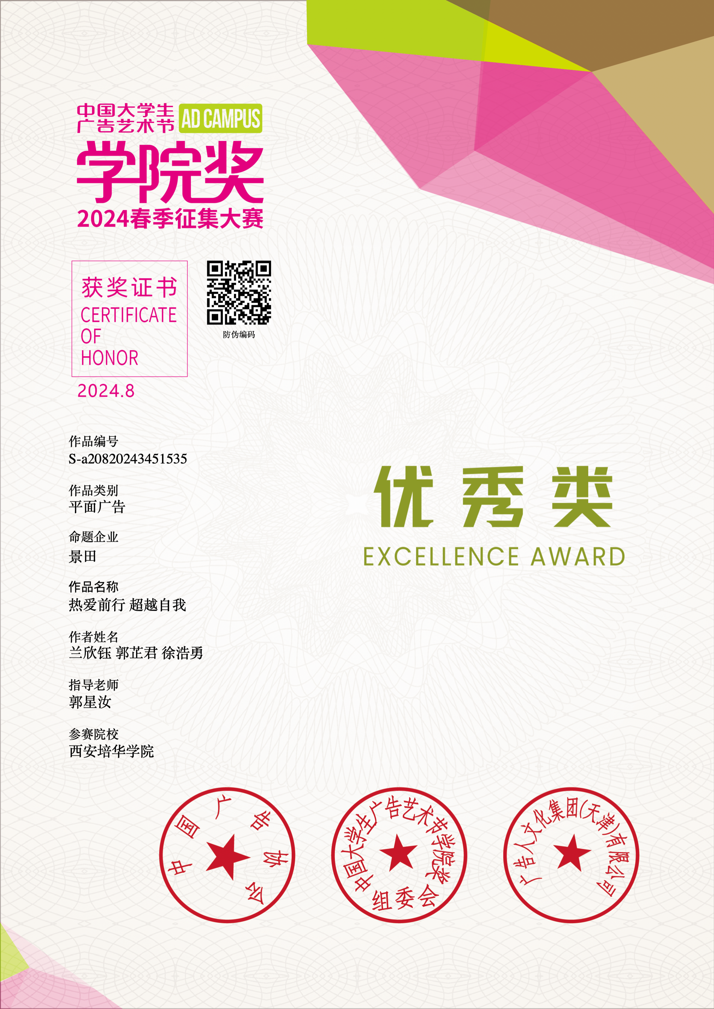 中国大学生广告艺术节学院奖(以下简称“学院奖”)是全国性的大学生广告专业奖项,学院奖始创于1999年,历经24年沿革,活动覆盖全国23个省、4个直辖市、5个自治区、2个特别行政区以及海外的共计1830所高校的5309个院系,每年有超过150万名师生直接参赛,收到来自全国各高校学子的40多万件创意作品。在全国各高等院校中深入人心,其影响已从高校延伸至广告行业,成为行业遴选人才,企业获取新鲜创意,品牌探索年轻化的重要途径。本次参加学院奖比赛项目共计20个,其中获奖作品5项。