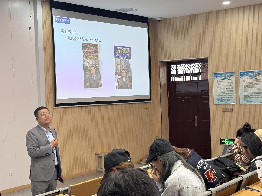 汤德涛先生以其在实体企业数字营销领域的实战经验和实操分享,为学生们带来了一场理论与实践相结合的知识盛宴。讲座内容涵盖了企业号短视频定位、企业蓝V号人设搭建、短视频内容创作与文案编写、账户运营策略、未来星公司成果展示、企业短视频直播技巧以及短视频发展趋势等多个维度。