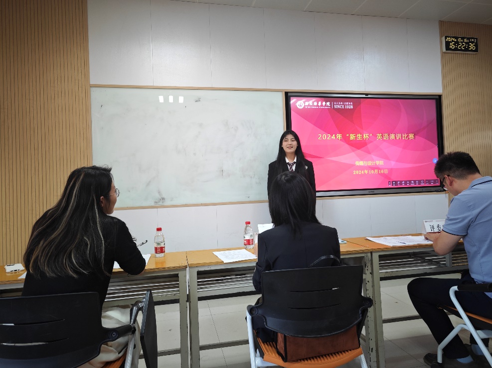 2024年10月16日下午,传媒与设计学院在6423教室隆重举行了2024年度“新生杯”英语演讲比赛。此次比赛旨在激发新生的英语学习热情,提升大学生的英语口语表达能力和逻辑思维能力,同时为同学们提供一个展示自我、挑战自我的平台。