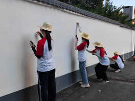 随后,实践队成员有条不紊地开始墙绘创作。测量、打底稿、调颜料、上色,大家分工明确,通力合作。本次墙绘分两个主题:一是快乐童年,二是文明社区。快乐童年串联起儿童生活场景,希望社区的小朋友通过画中场景培养积极的生活和学习习惯,健康快乐成长。文明社区主题墙绘将社会主义核心价值观融入图画场景,推动移风易俗,倡导居民合力建设文明和谐的社区。