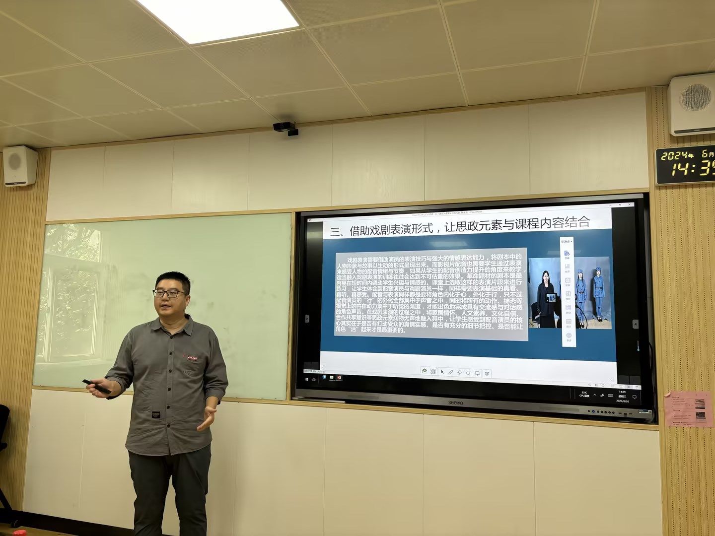 播音与主持艺术专业教师陈连龙对课程《影视片配音》进行了现场教学展示,详细阐释了课程蕴含的德育元素、思政元素与课程内容结合、融入课程思政元素的教学案例等内容,他讲到,课程教师要分门别类地进行思政元素设计,突出教学章节、教学方法、知识点、思政元素案例、培养目标等内容,在课程设计理念上紧紧围绕立德树人的核心要点,做到心中有数,有规可循。