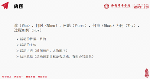 培训最后,郝甜甜老师向大家介绍了积累新闻语言、拓宽选题思路的方法。好的新闻来源于自身对语言、对班级、组织、学院的热爱及细心观察,希望同学们能够常观察、勤思考、多练习,讲好班级故事、讲好建艺人自己的故事。